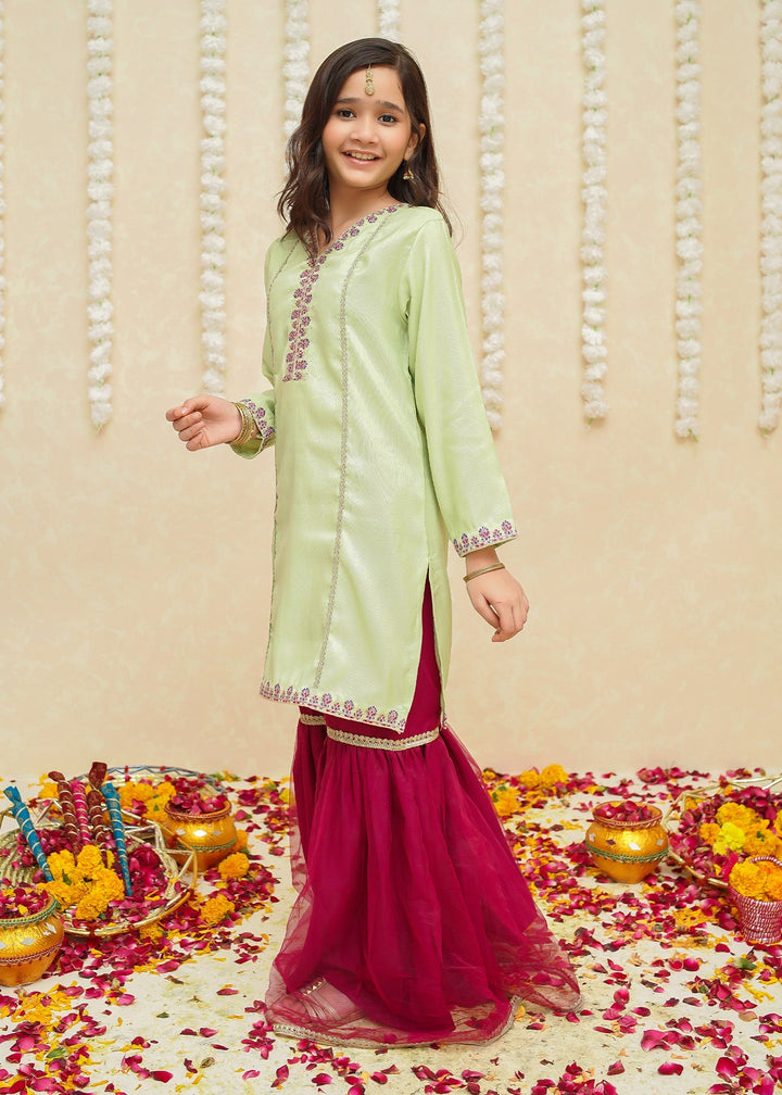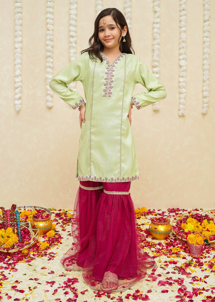 This beautiful Raw Silk shirt features intricate neck detailing. Paired with a net gharara, it's a perfect pick for festive occasions and celebrations