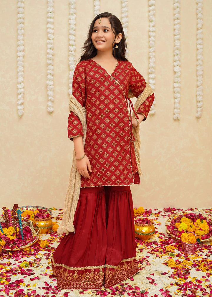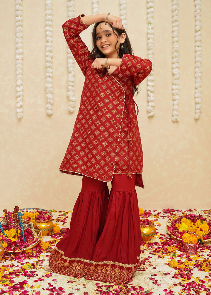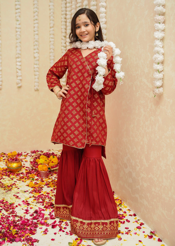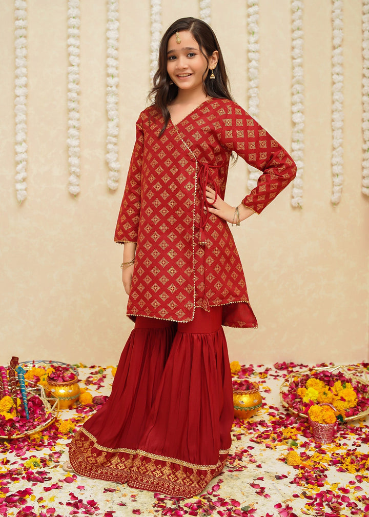 This stunning Raw Silk anghrakha style shirt is beautifully designed, offering a perfect blend of tradition and elegance. Paired with a graceful gharara, it?s an ideal choice for festive events and celebrations.