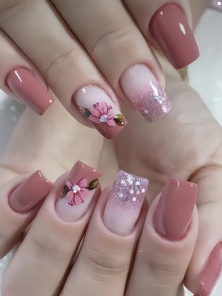 Shein - Instantly Upgrade Your Look With 24Pcs Middle Square Modernist Daily Classic False Nails Elegant Sparkling Water Diamond Glitter Sequin Rose Flower Rose Red Full Cover Detachable