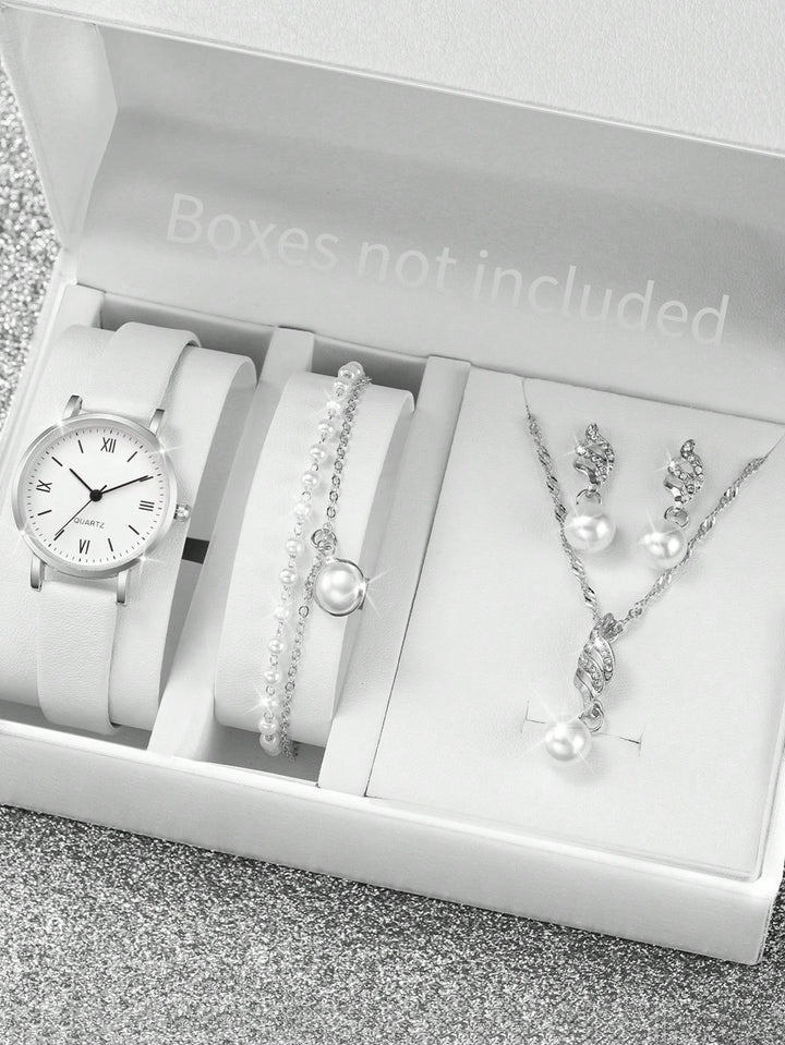 Shein - Ladies' Leather Strap Fashionable Minimalist Numeric Markers Dial Quartz Watch And Jewelry Set (5pcs/set)