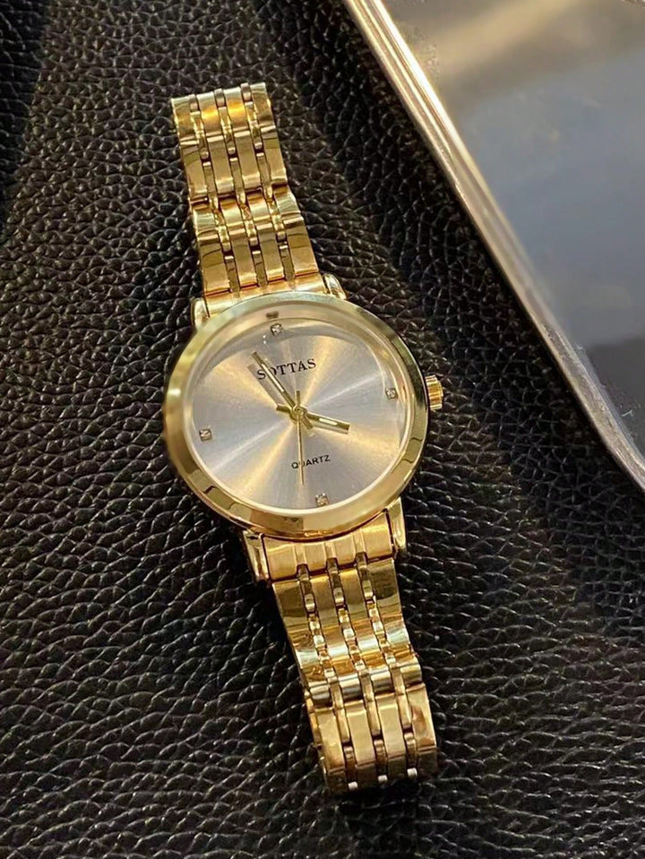 Shein - Latest Korean Style Women's Watch, Gold & White Dial, Waterproof, Stainless Steel Strap, Fashionable & Casual Quartz Wristwatch