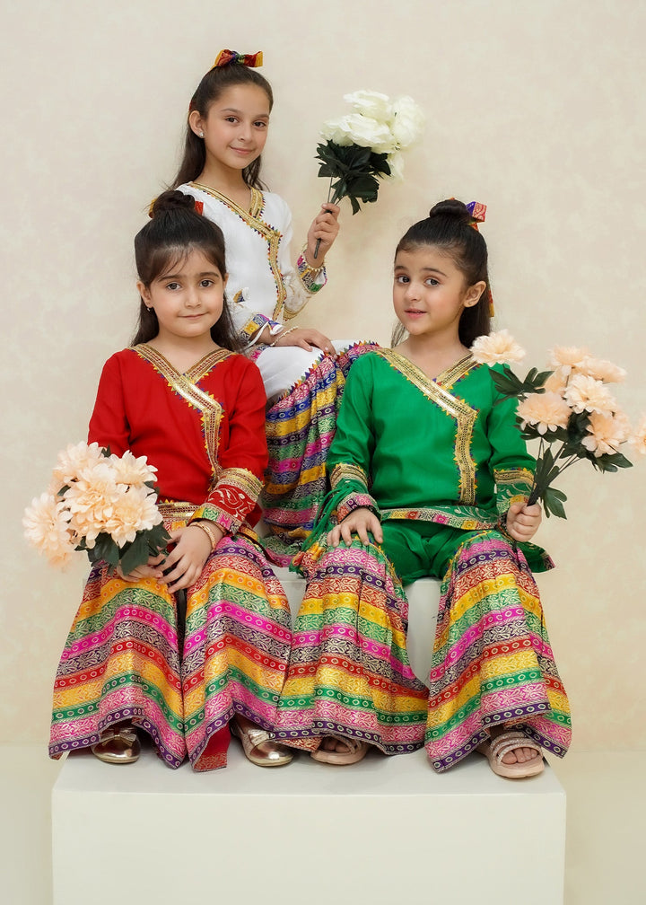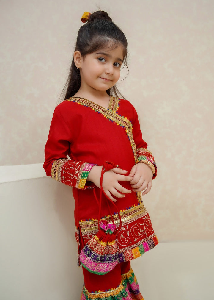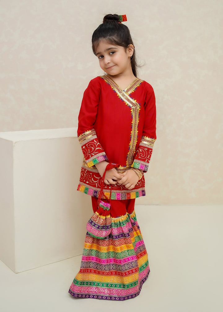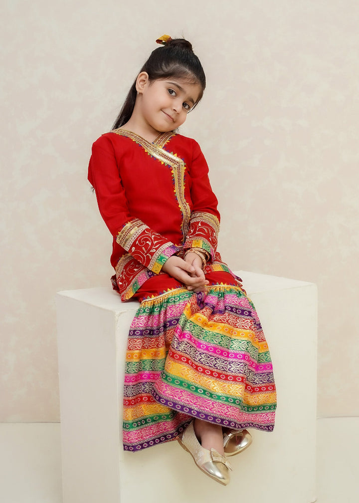 - Detailing: Angrakha style kurti embellished with gota lace all over completed with gorgeous border paired with jamawar gharara and net dupatta.