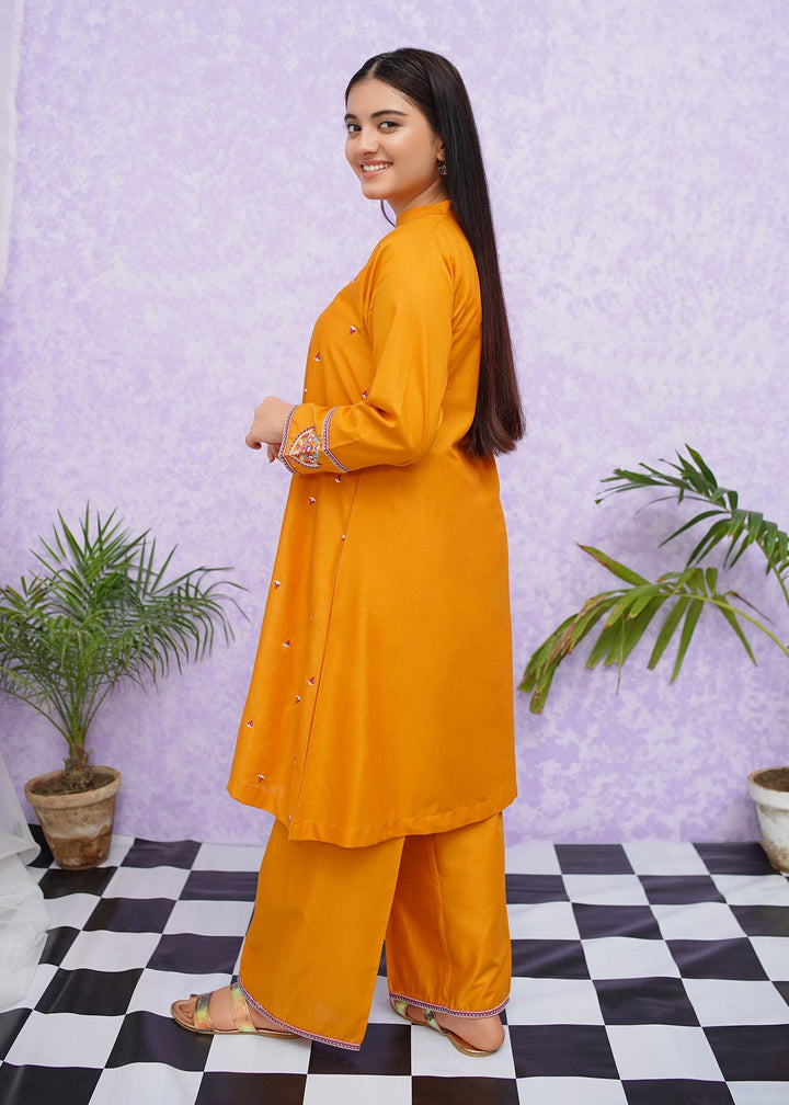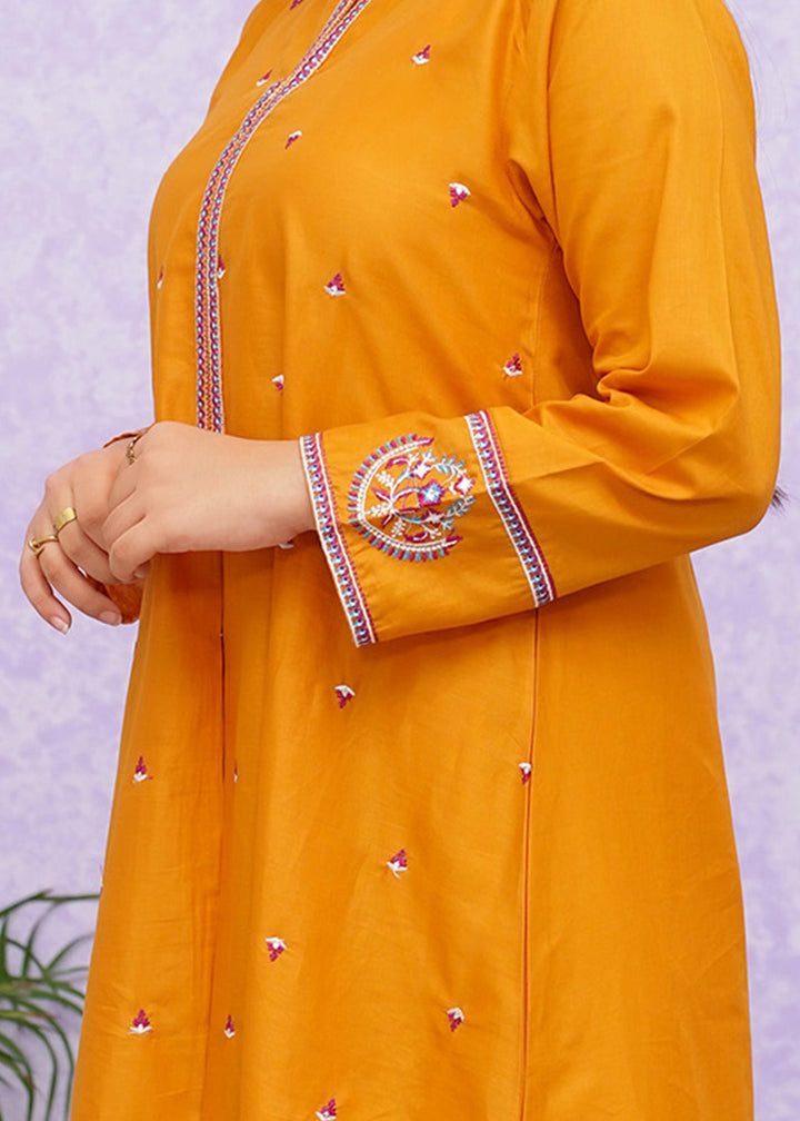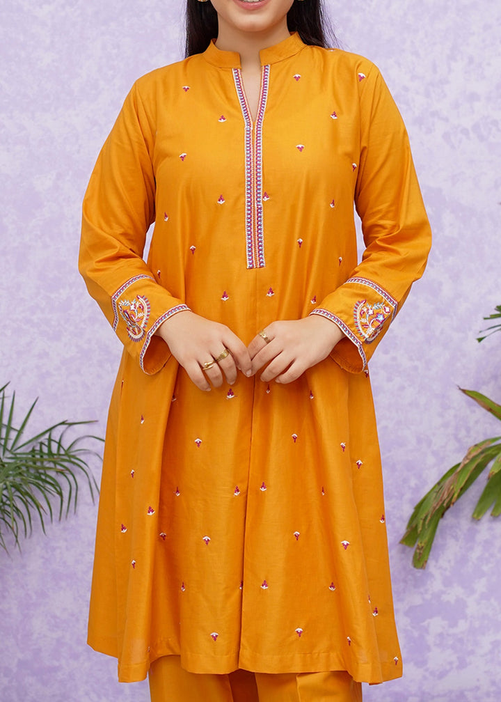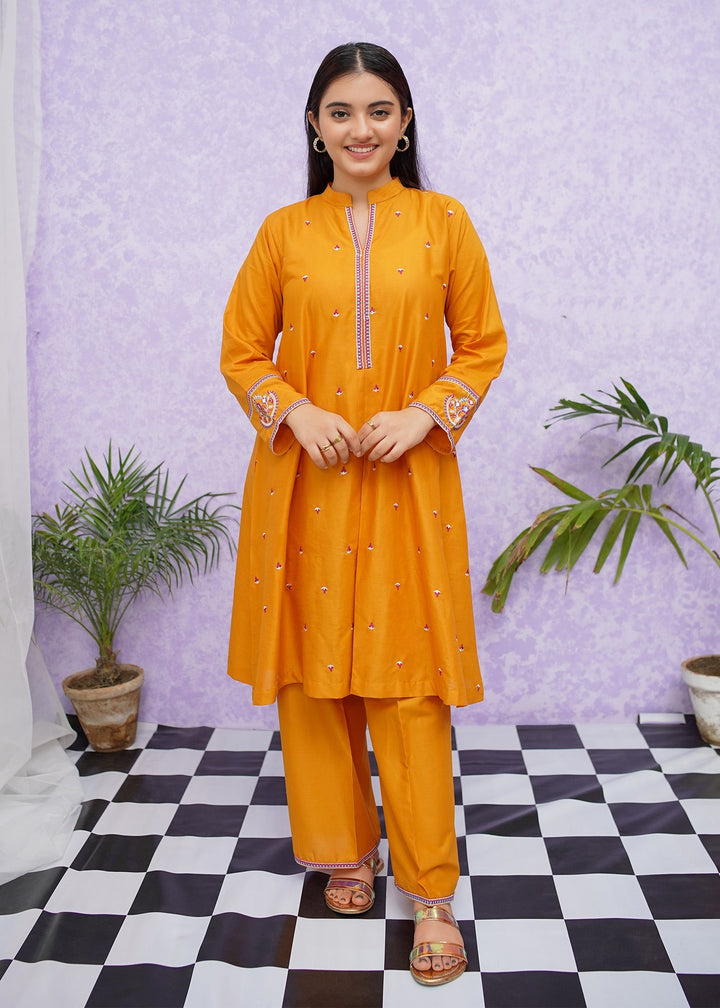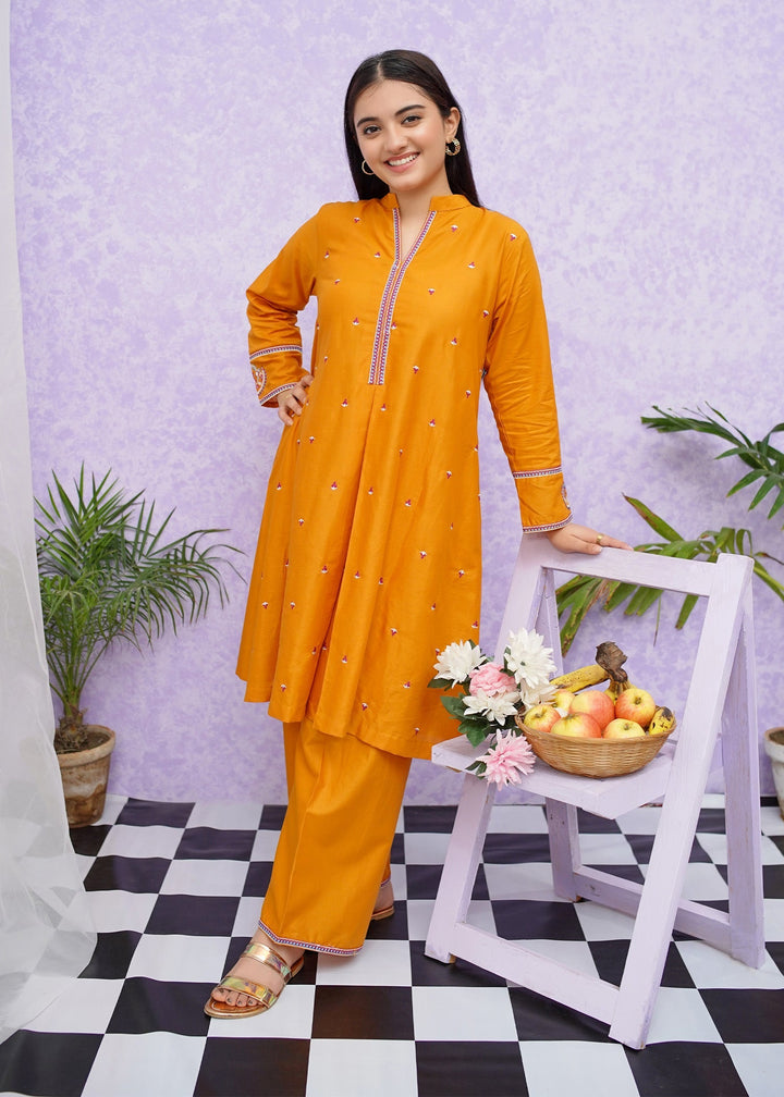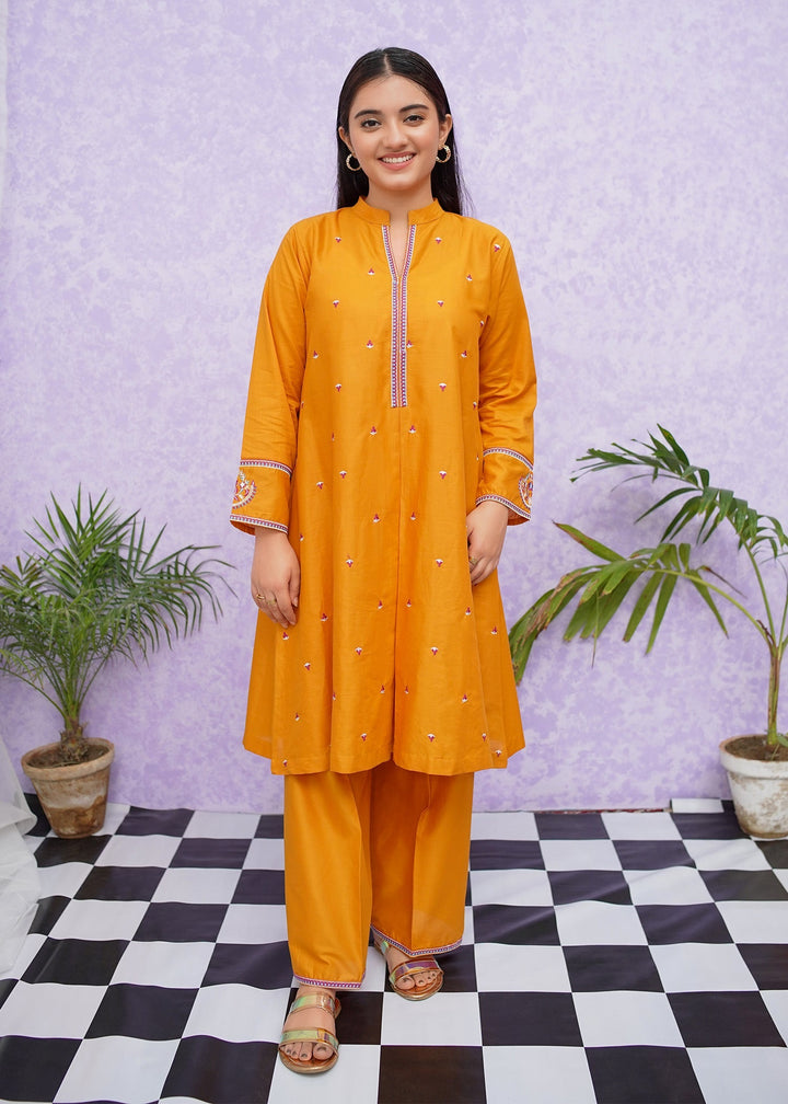 Girls cotton embroidered two-piece kurta set in short frock style detailed with fine embroidery and paired with loose fit trouser