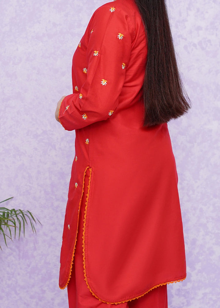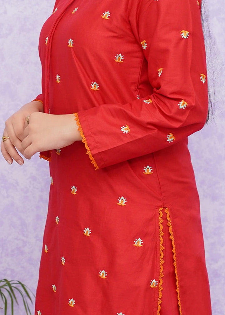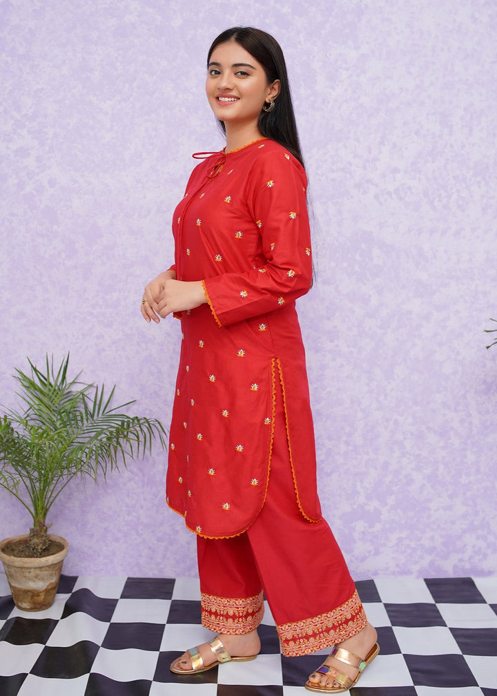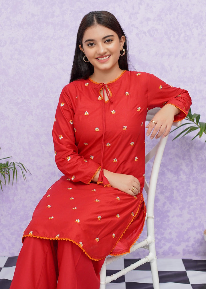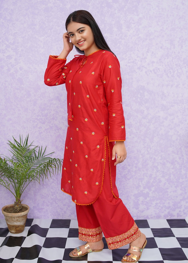 Red two-piece cotton embroidered kurta set for teens. Embroidered knee length shirt paired with embroidered loose-fit trousers.