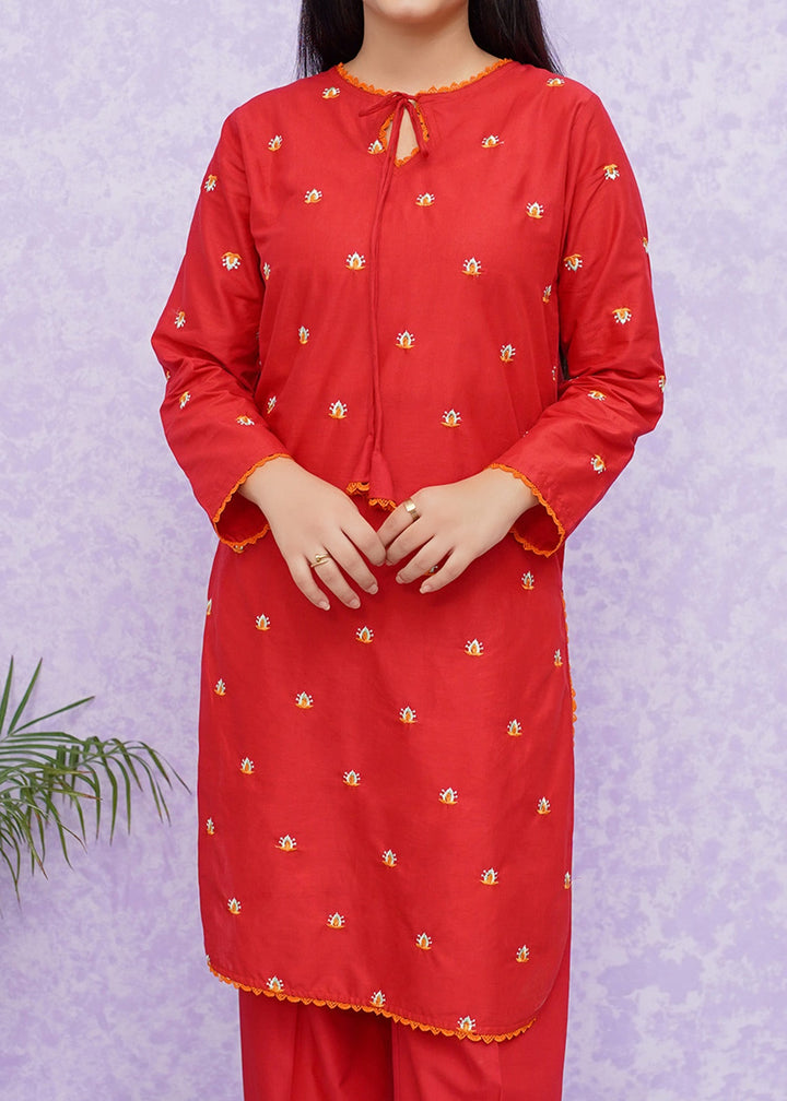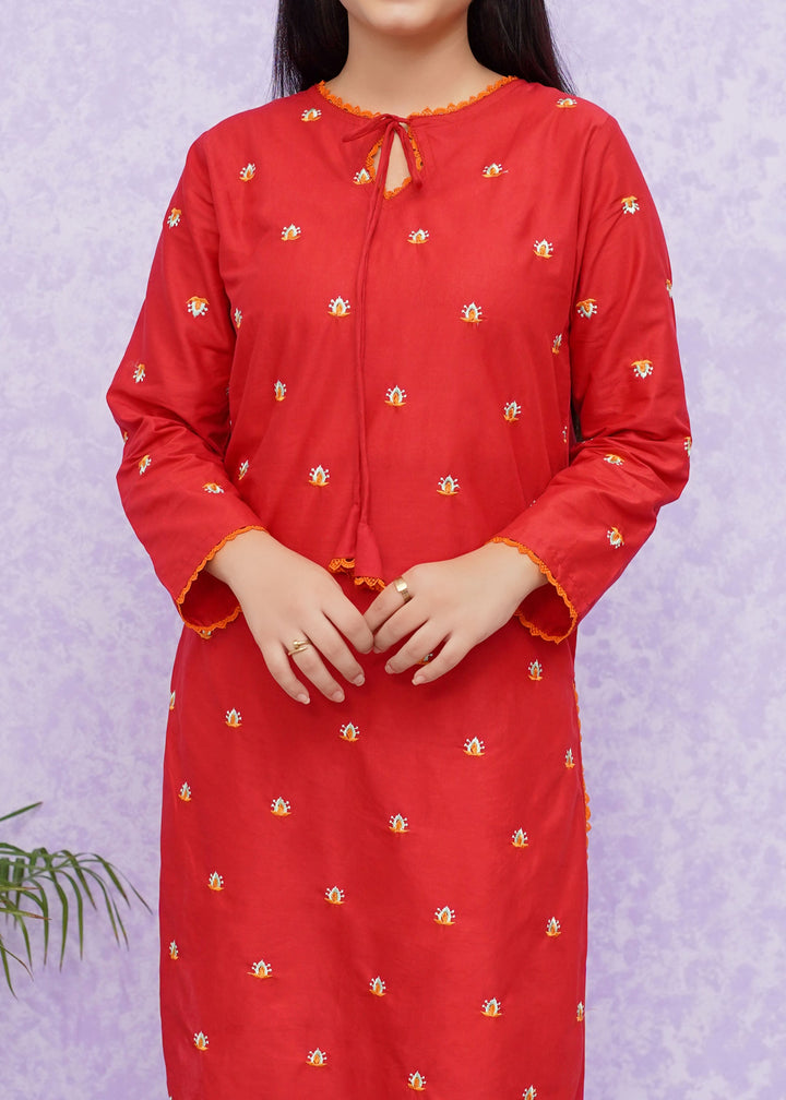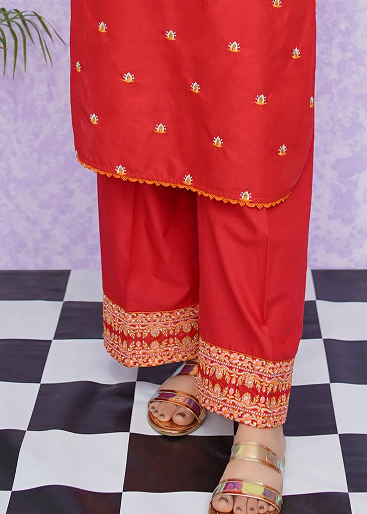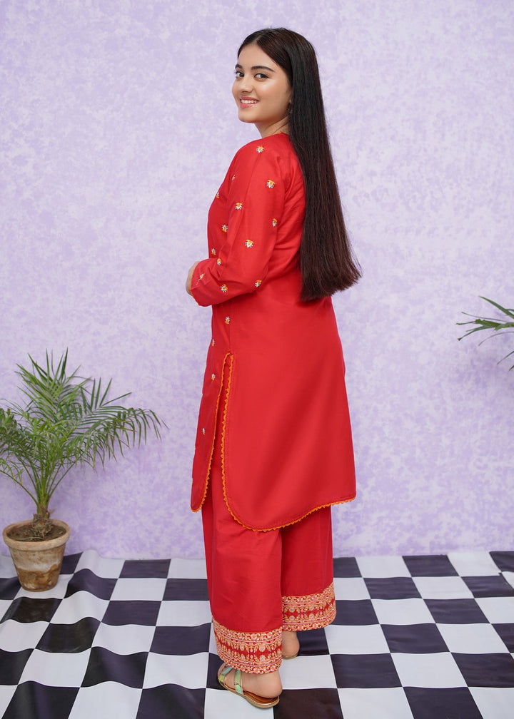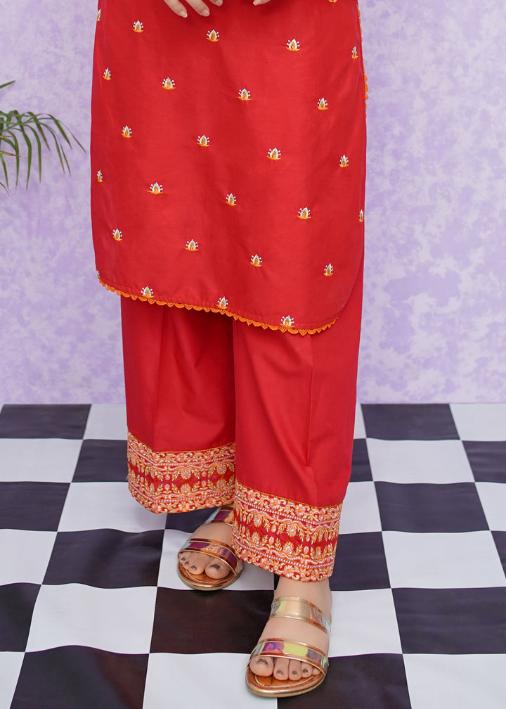 Red two-piece cotton embroidered kurta set for teens. Embroidered knee length shirt paired with embroidered loose-fit trousers.