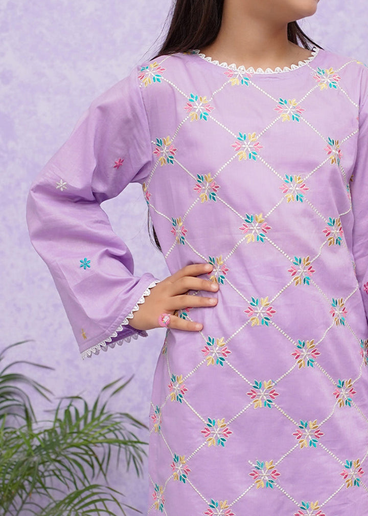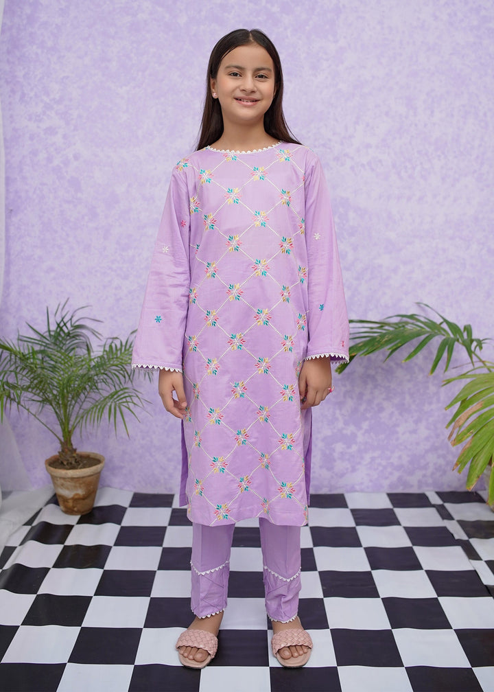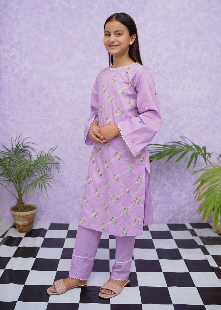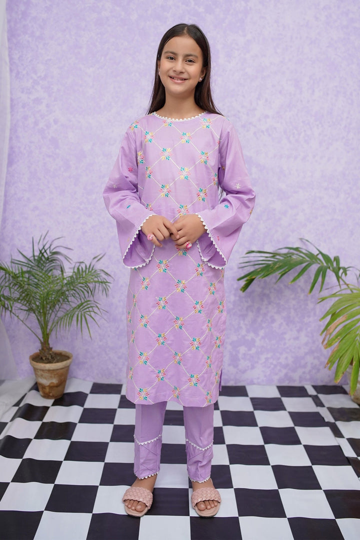 Girls cotton embroidered two-piece kurta set detailed with fine embroidery and paired with loose fit trouser