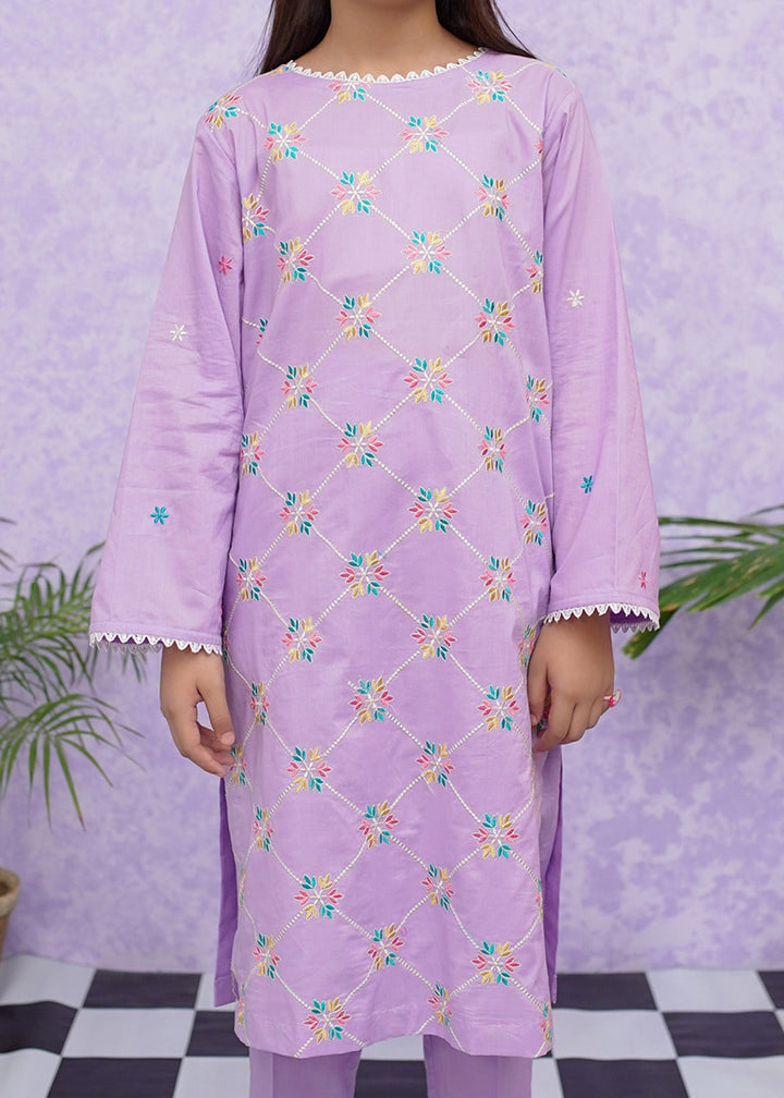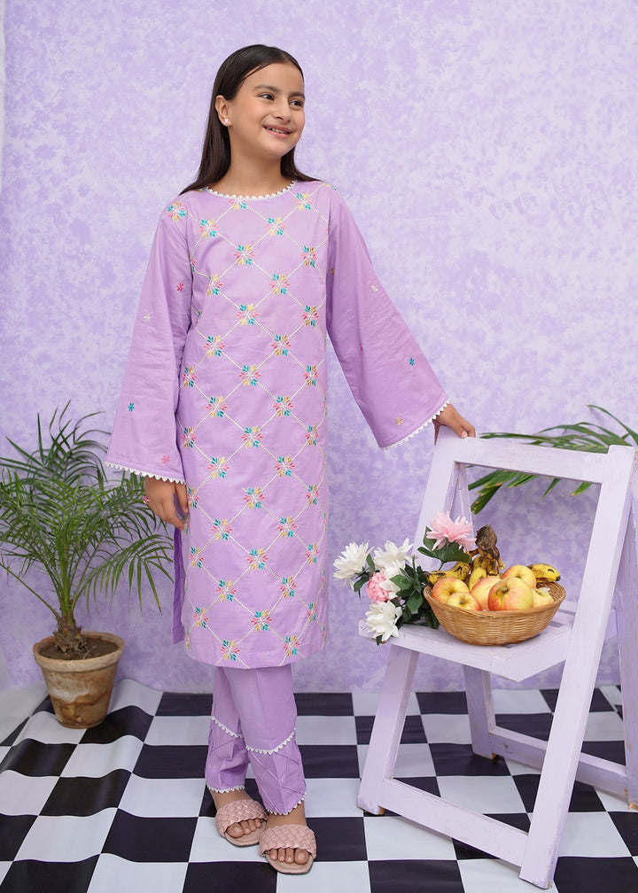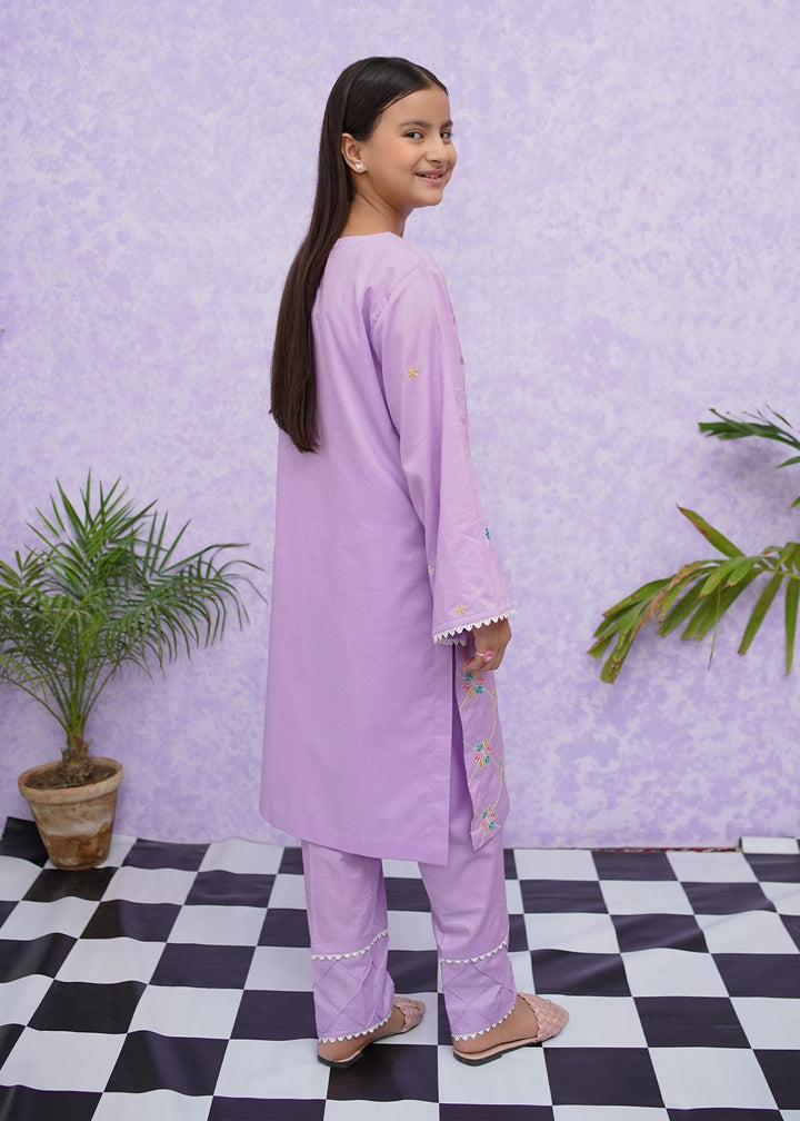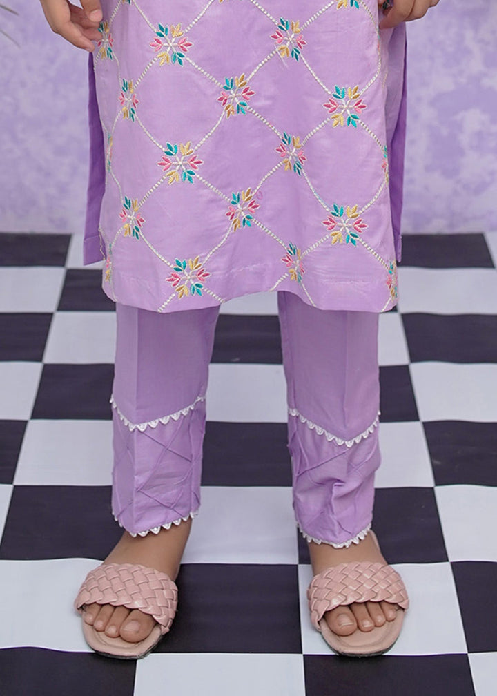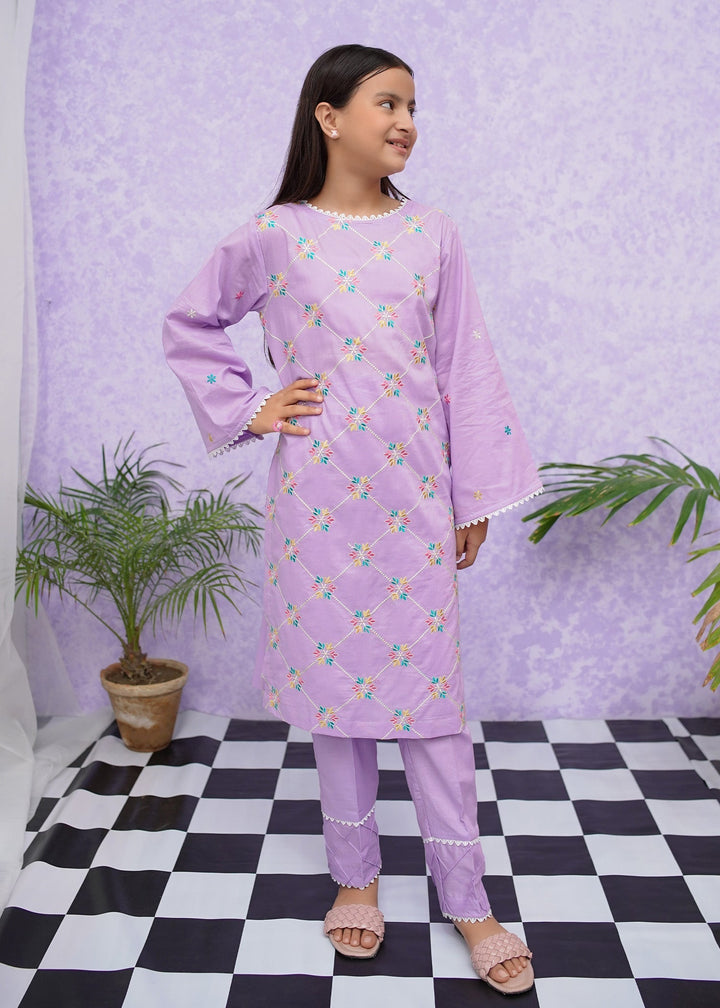 Girls cotton embroidered two-piece kurta set detailed with fine embroidery and paired with loose fit trouser