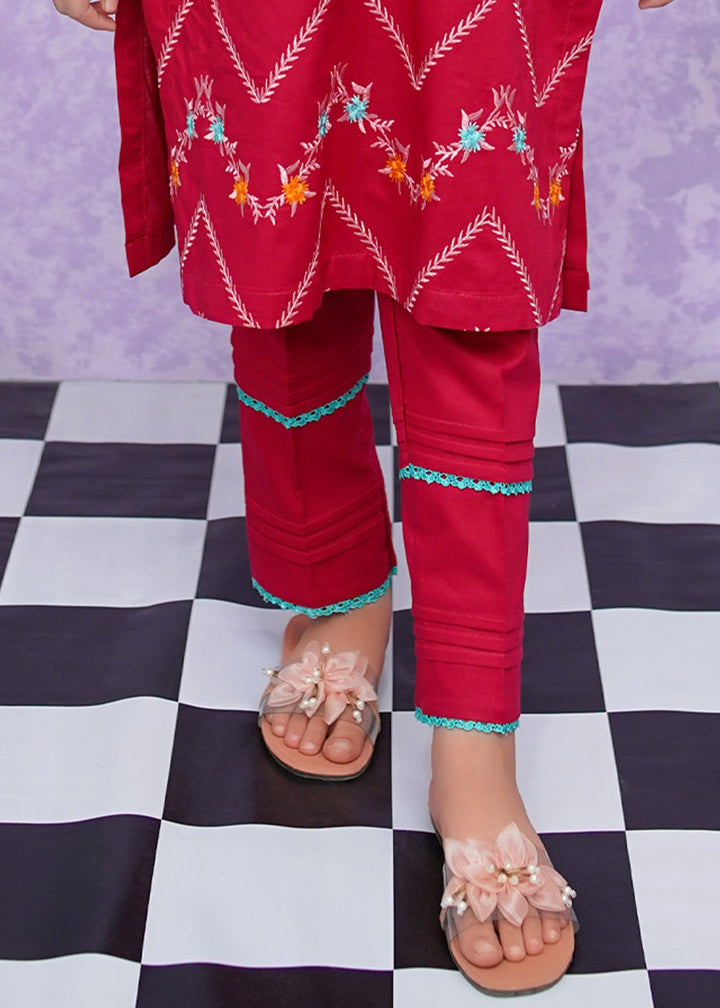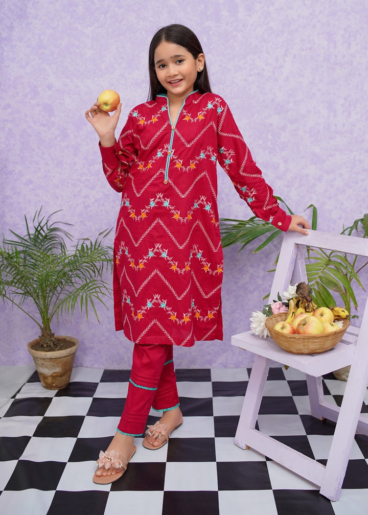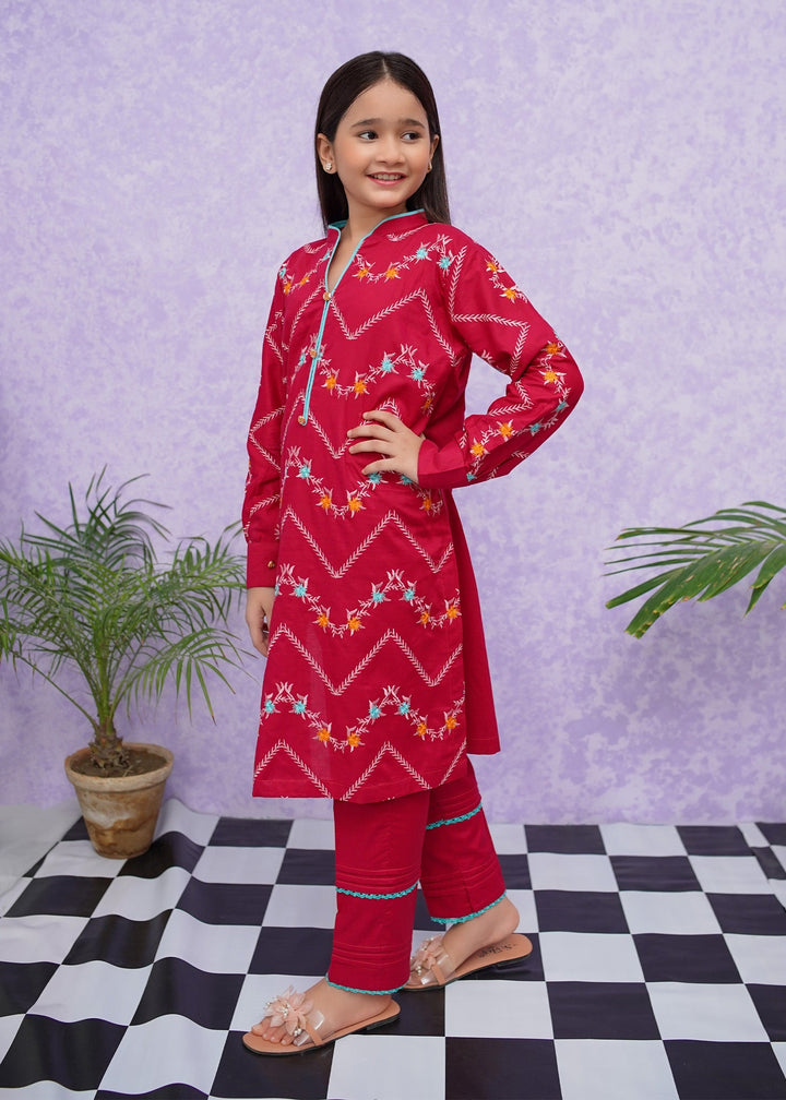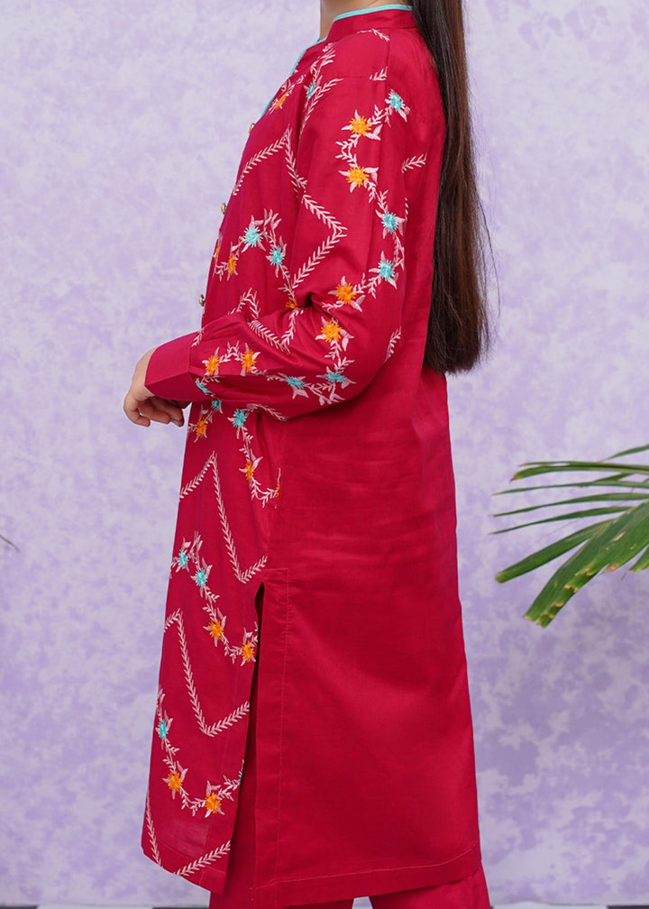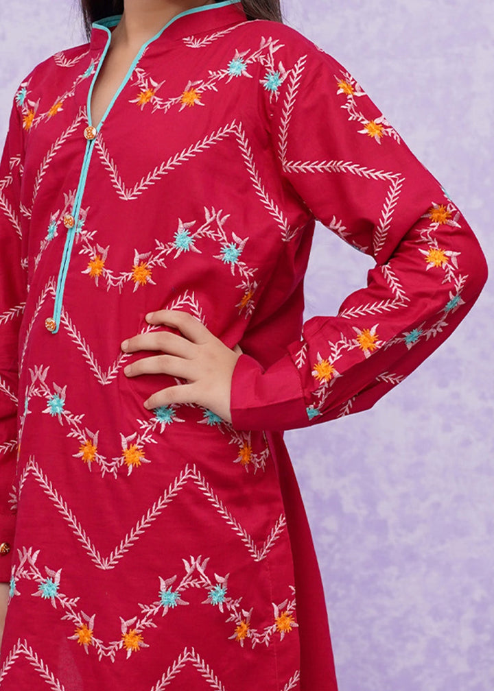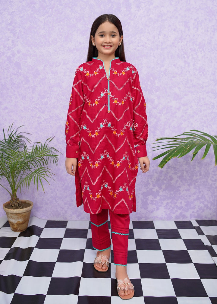 Girls cotton embroidered two-piece kurta set detailed with fine embroidery and paired with loose fit trouser