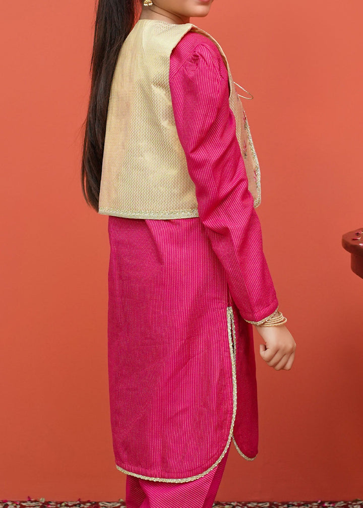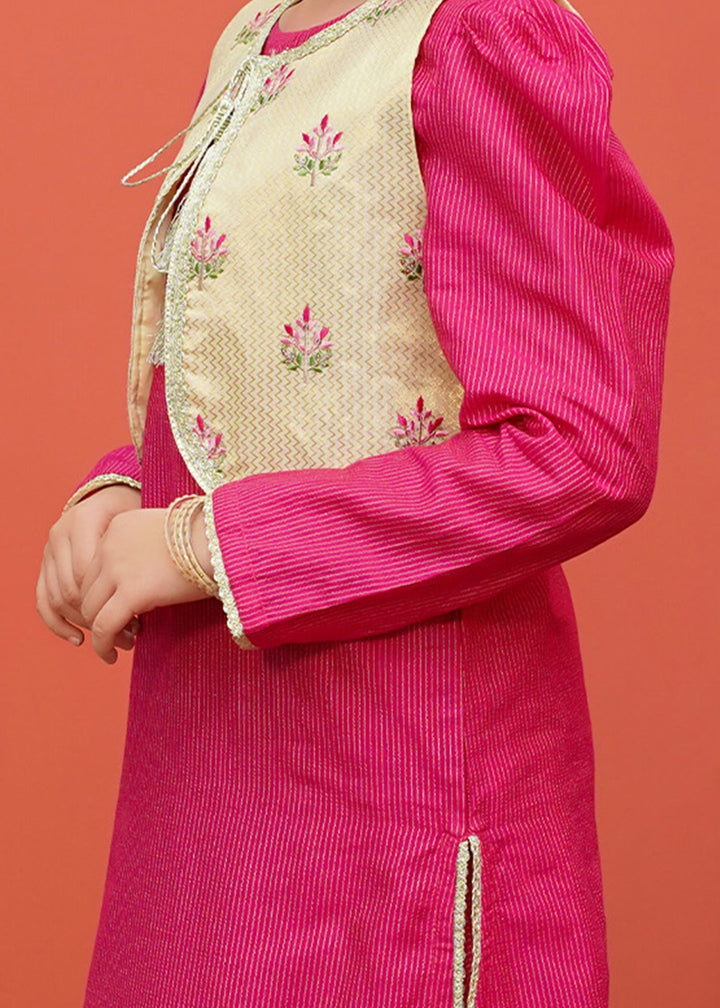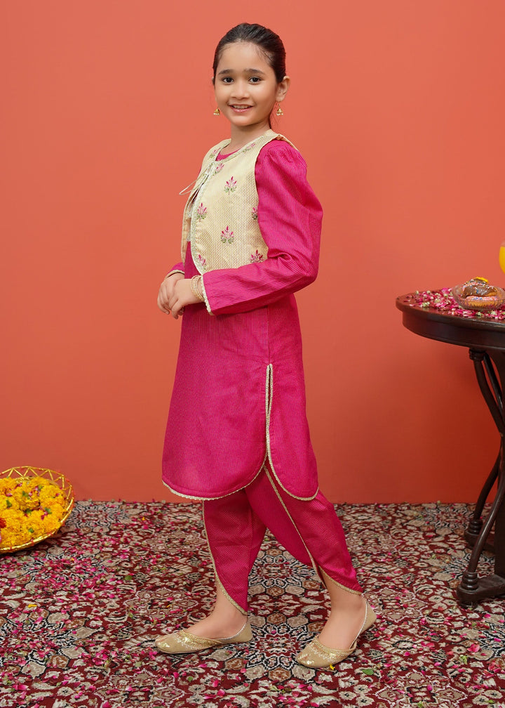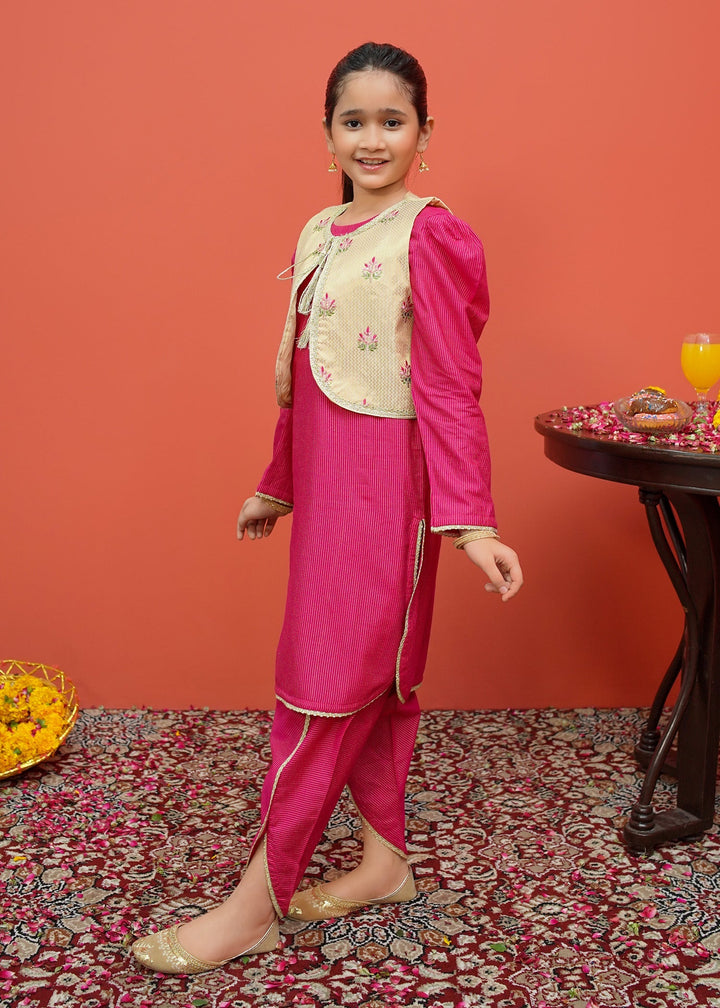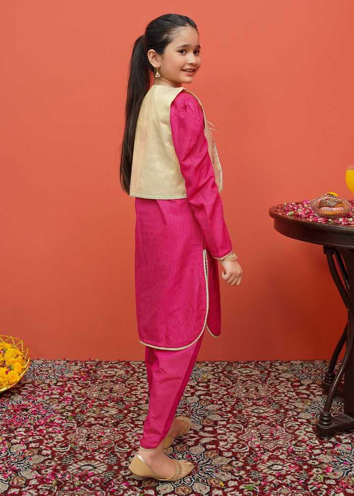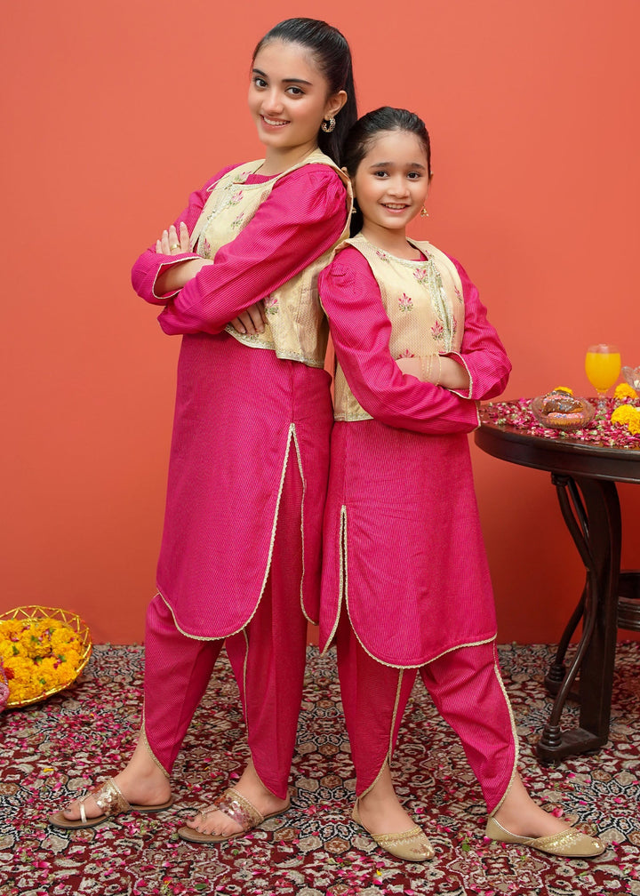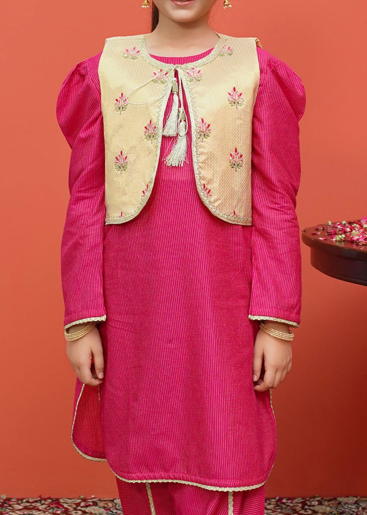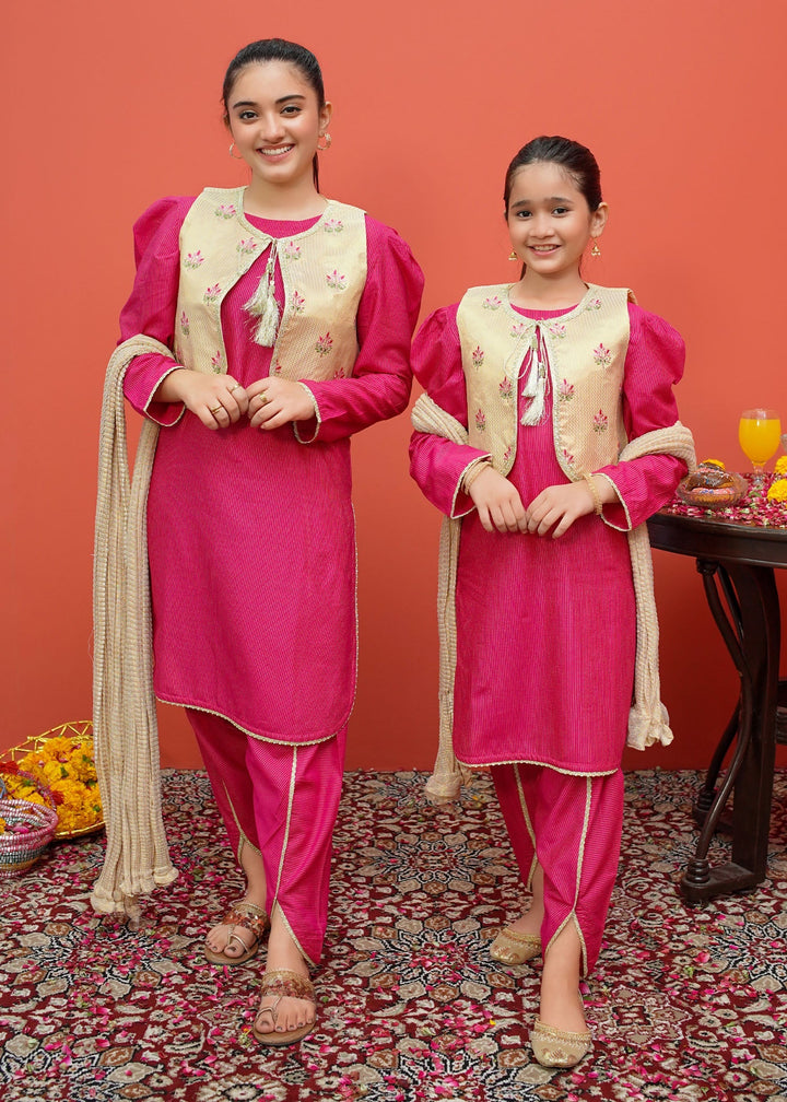Detailed pink shirt with embroidered koti paired with tulips shalwar and golden crush dupatta to make you look more elegant in this festive season.