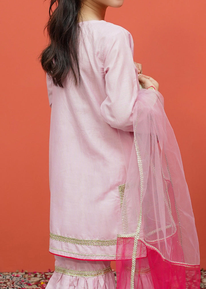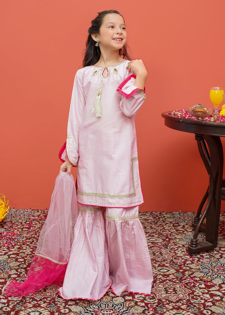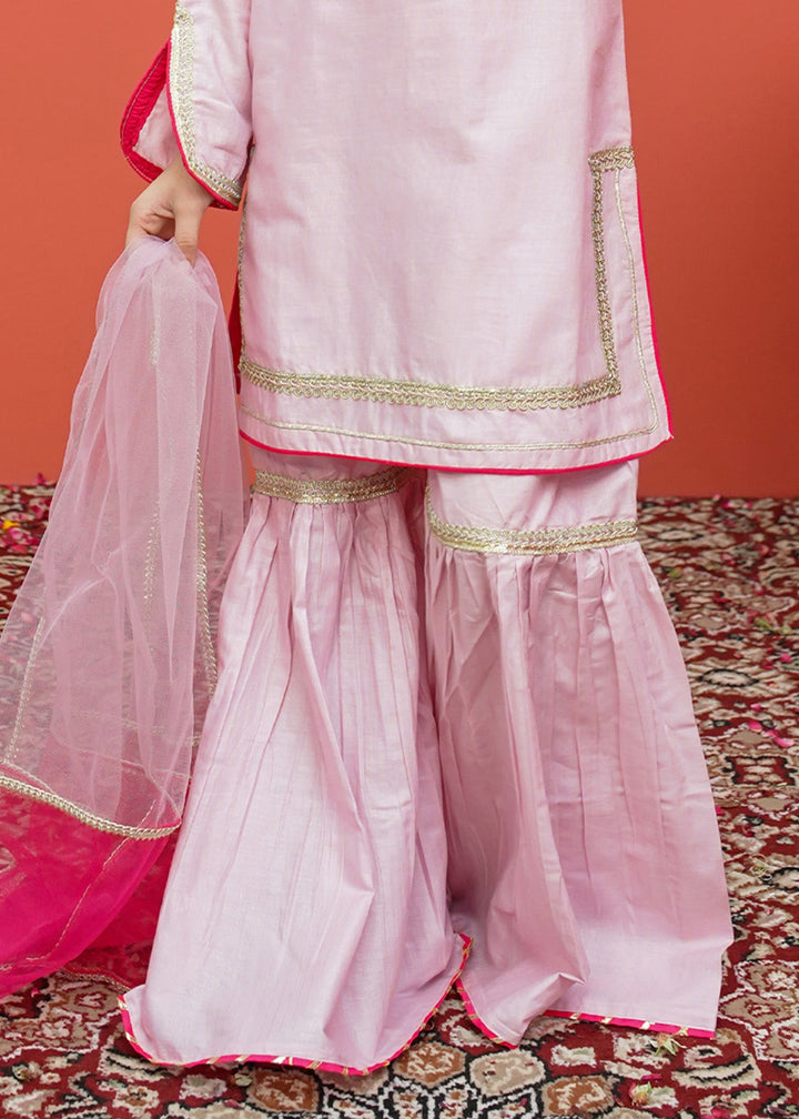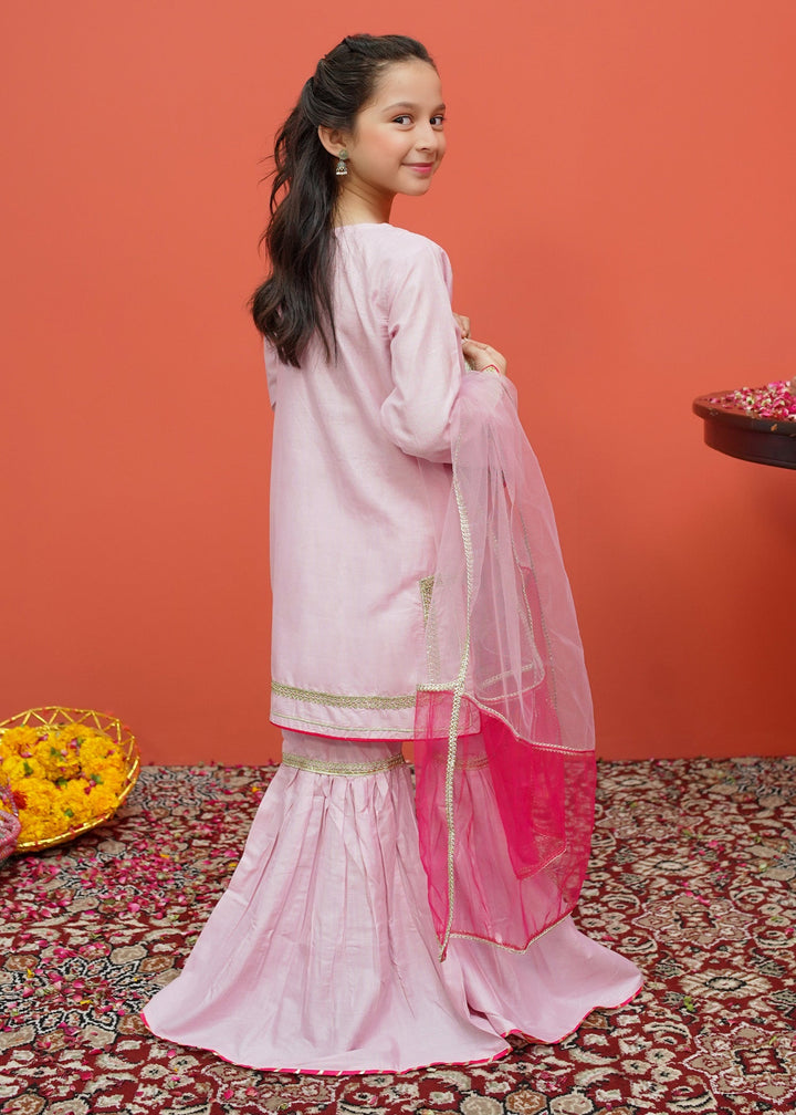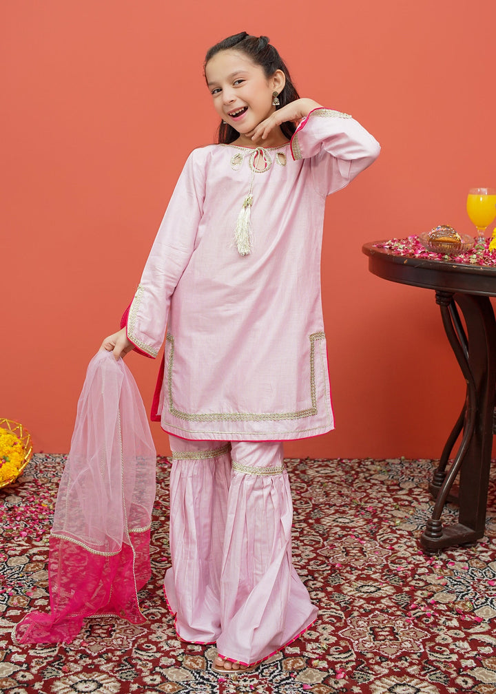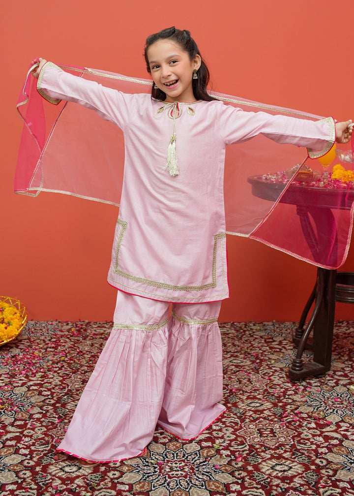 Dress your little girl in 3 piece gharara suit. Plain pink cotton shirt detailed with golden lace. paired with multi color dupatta and cotton gharara