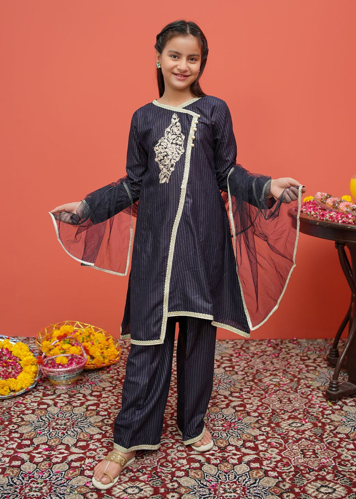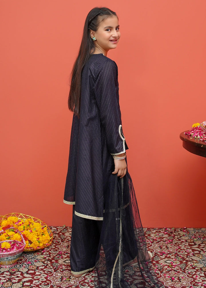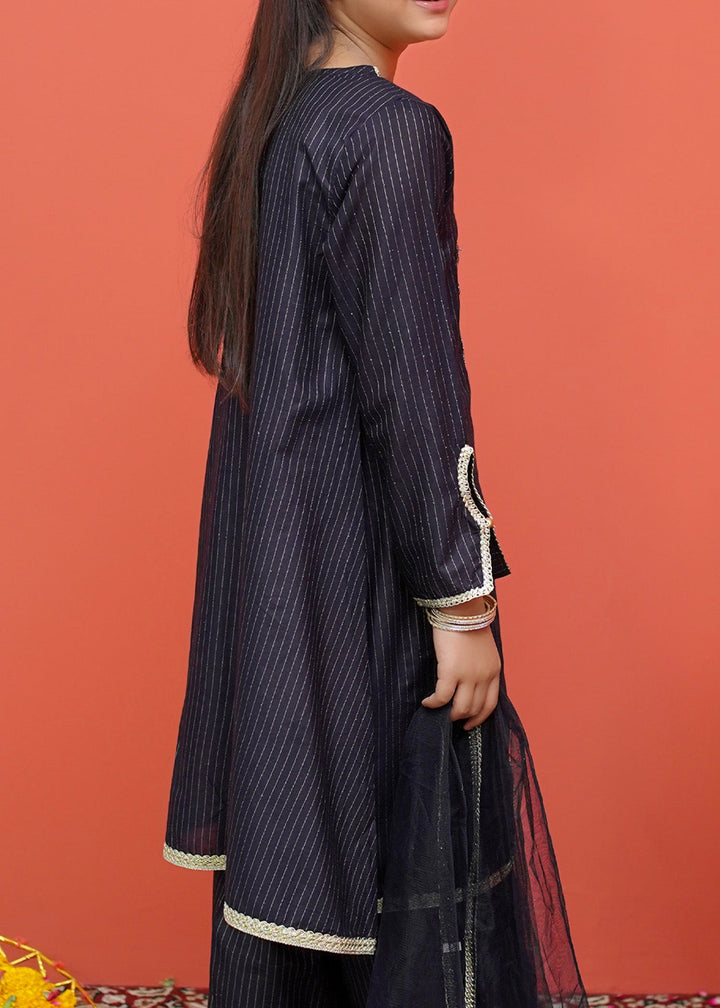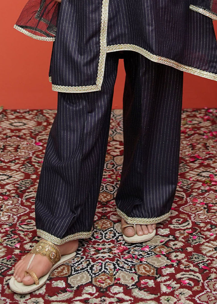 Three-piece cotton ensemble in black with detailing with golden embroidery on the chest and full-length sleeves paired with net dupatta and loose-fit trousers.