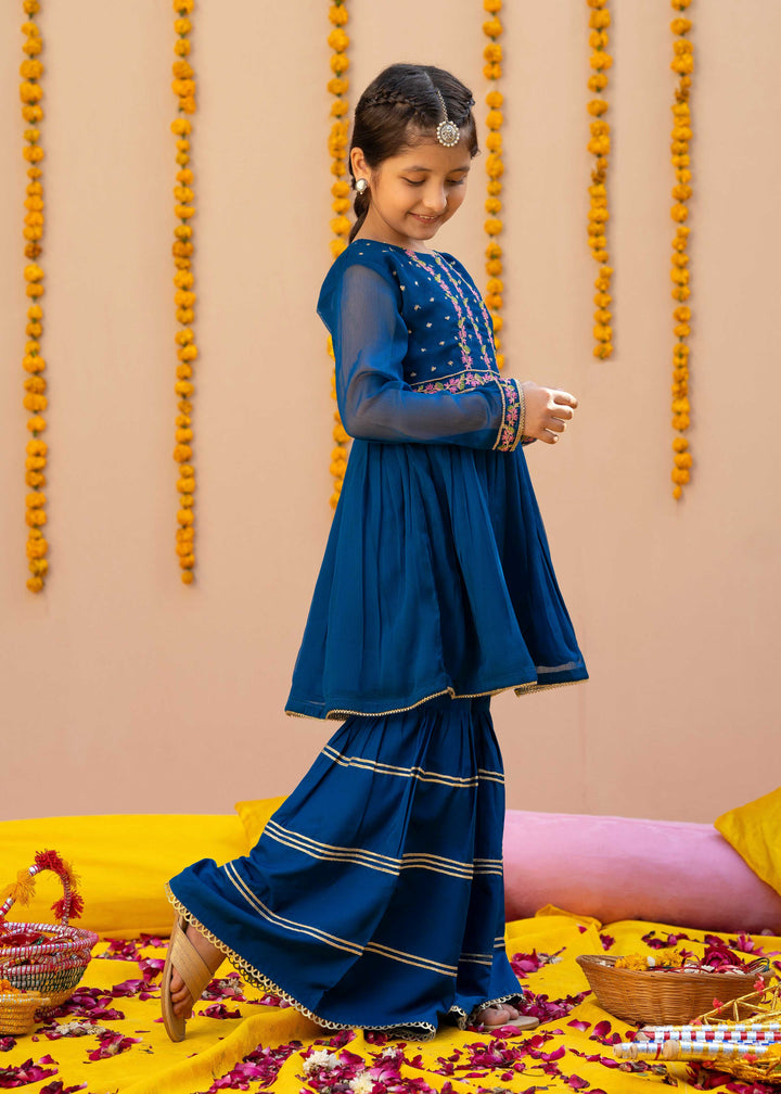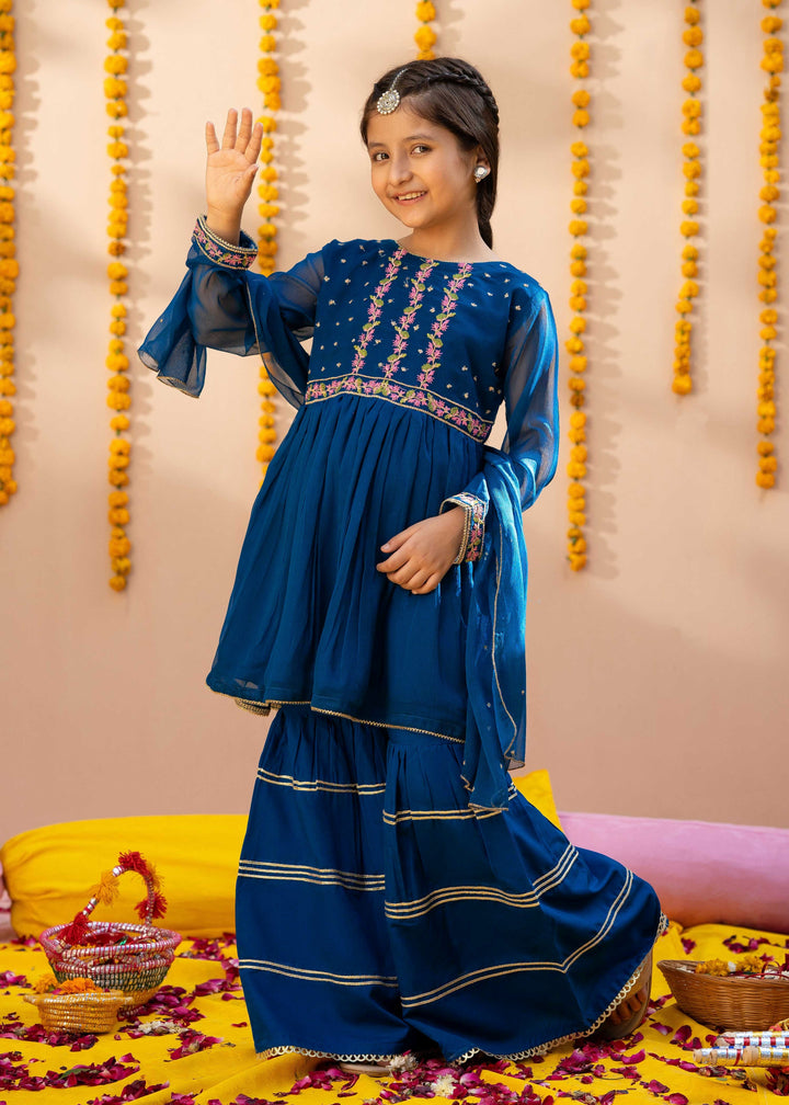 - Detailing: The lavish blue gharara outfit has a richly embellished kameez with fine embroidery in frock style paired with dupatta embellished with embroidery all over..