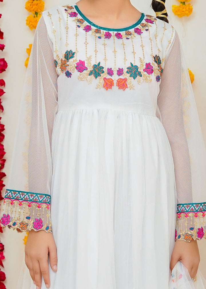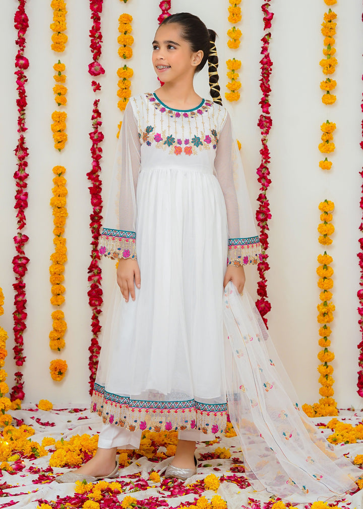 - Detailing: Elegant net material frock adorned with delicate embroidery along the neckline.