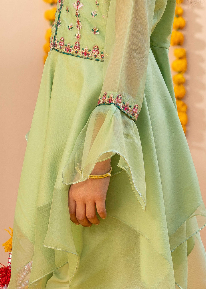 A richly hued green chiffon embroidered 3 piece suit for girls adorned with scintillating embroidery to create a sumptuous festive wear.