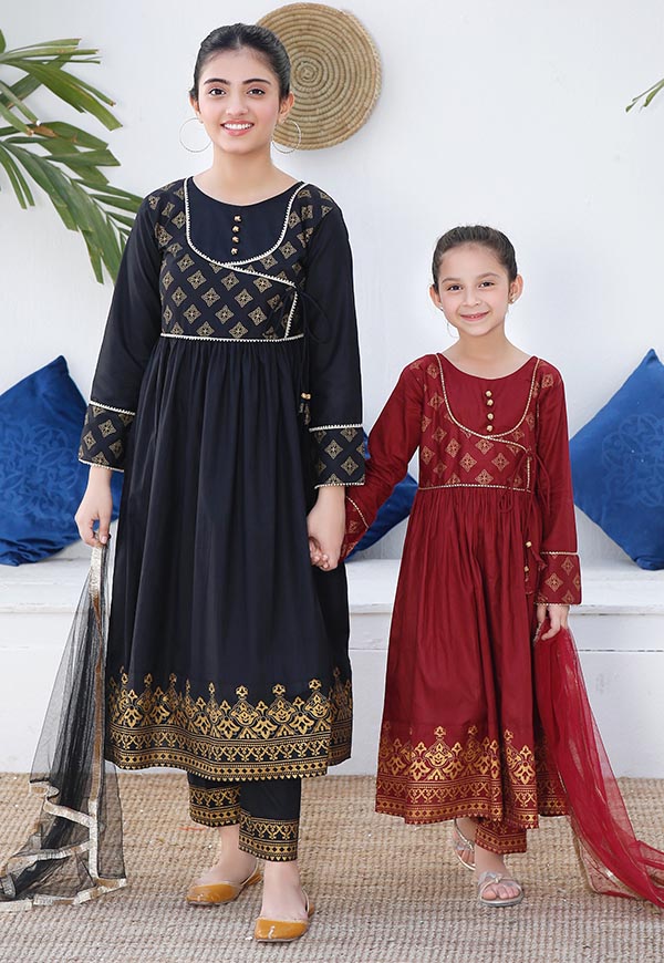 - Detailing: lavish festive outfit in maroon colour, resembling a genuine work of art! Our bright ensemble helps you enjoy the spirit of joy in style and is embellished with a passionate gold block pattern.