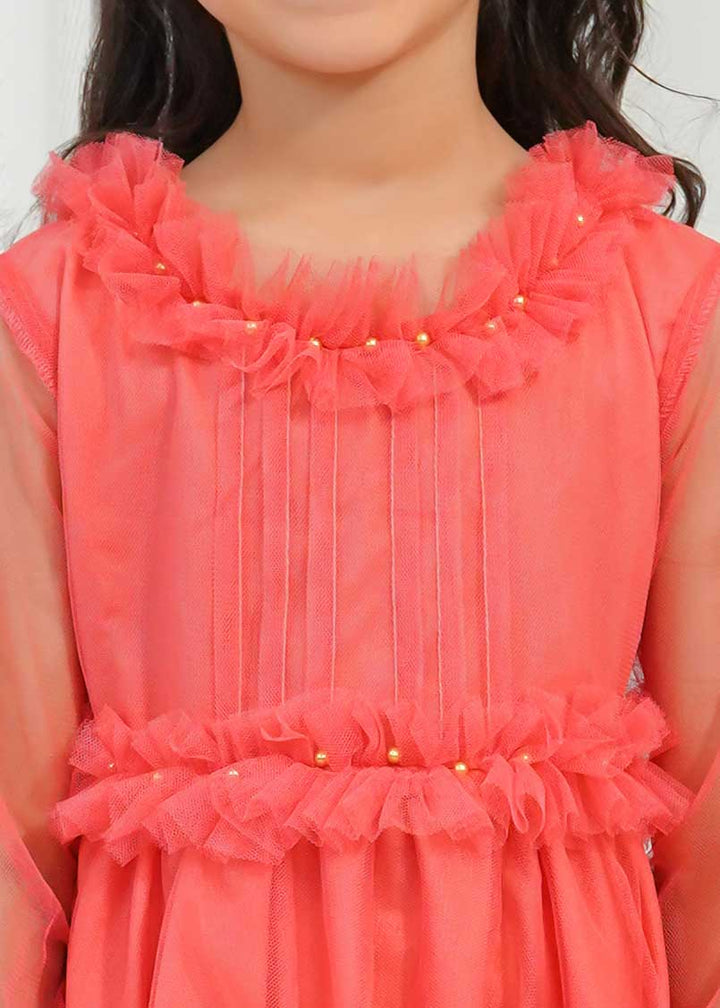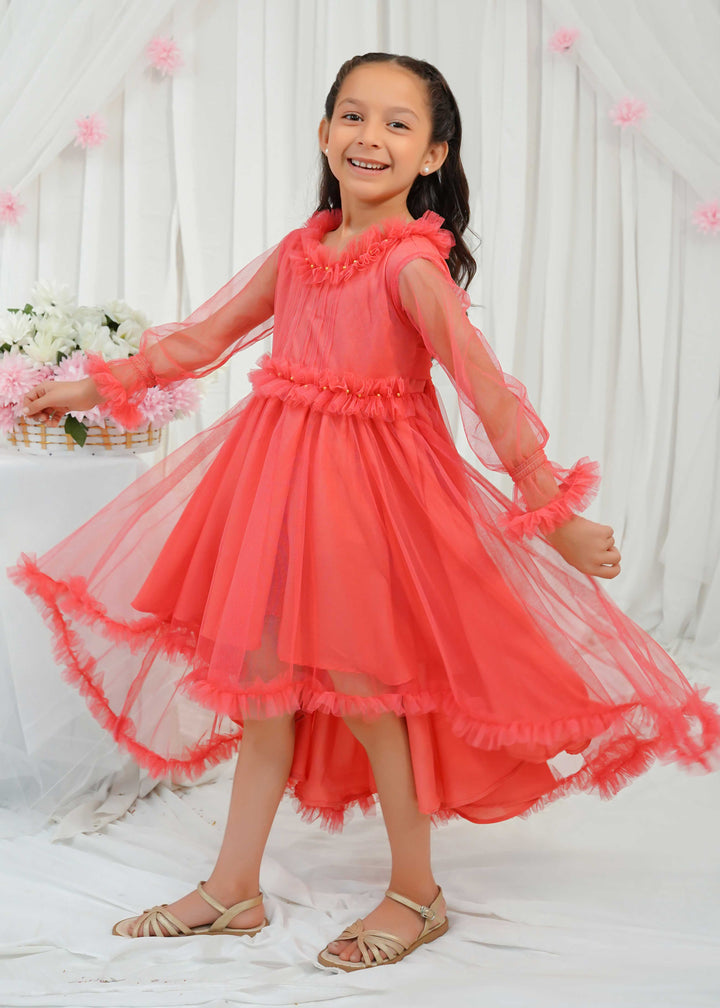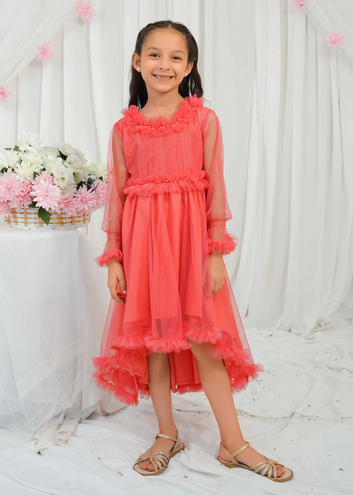 Detailing: a net tail frock with Pentax detailing on the bodice and ruffles with pearls on the neckline and waistline.