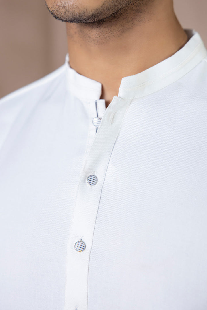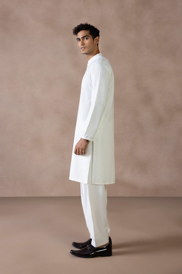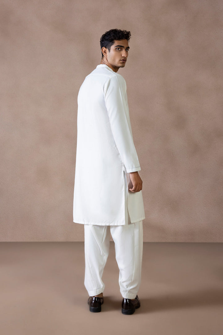 Upgrade your wardrobe with classic off white hued winter was & wear two-piece ensemble featuring detailing on band and cuffs paired with a matching shalwar.