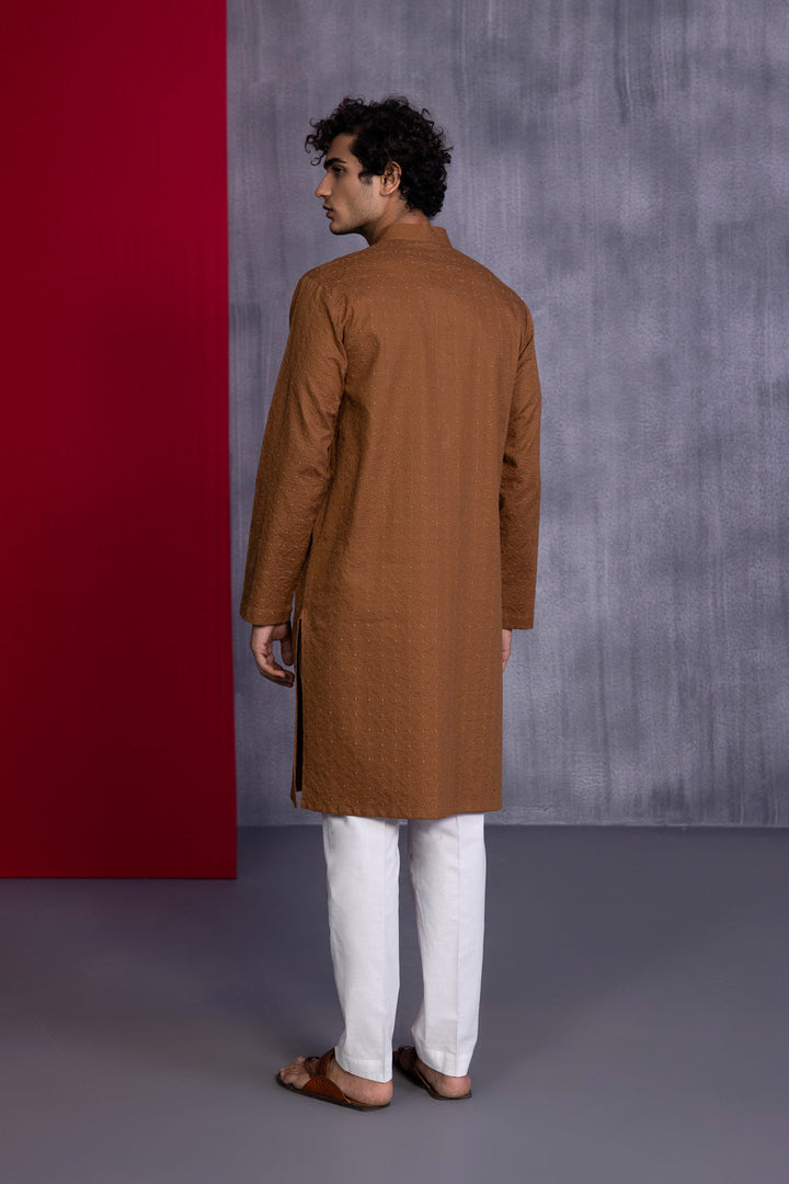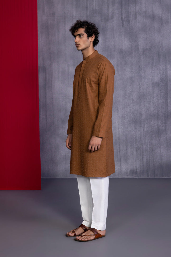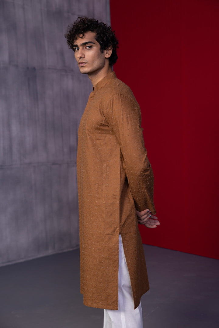 Elevate your look with this rust hued Cotton Schiffli embroidered kurta featuring band neckline.