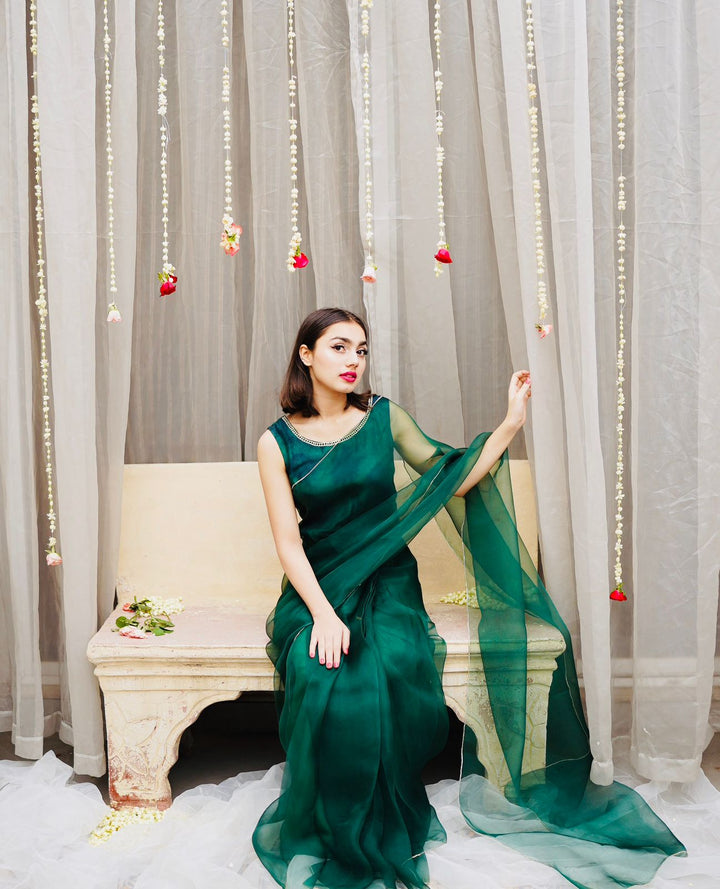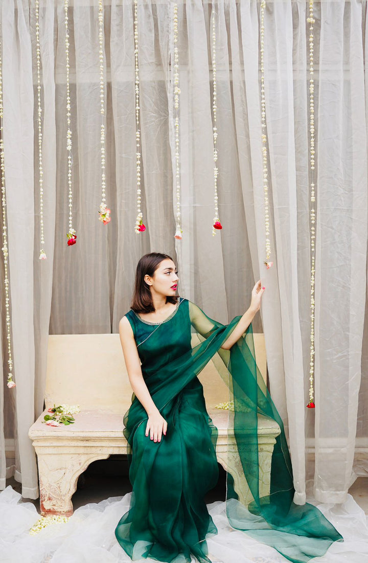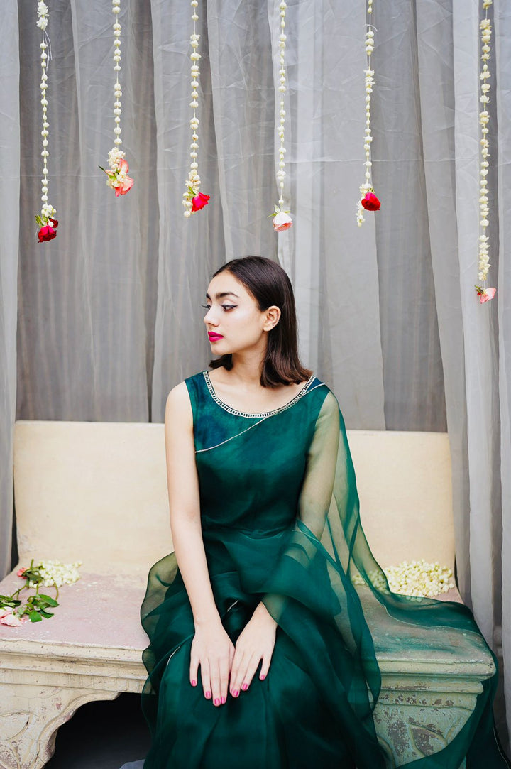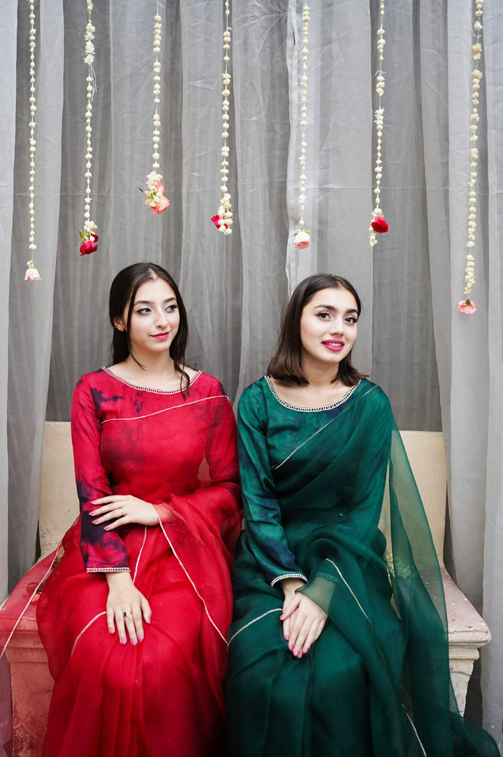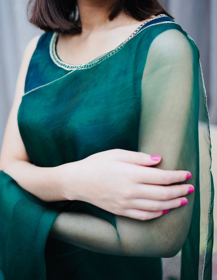 Teal and zinc tie and dyed Sarhi With minimal tilla embroidery details along with Full fitted Sleeves Blouse