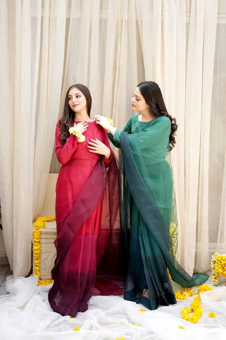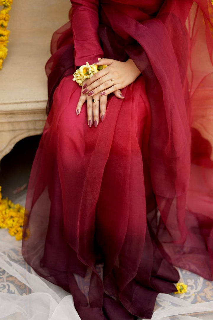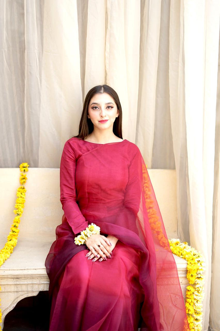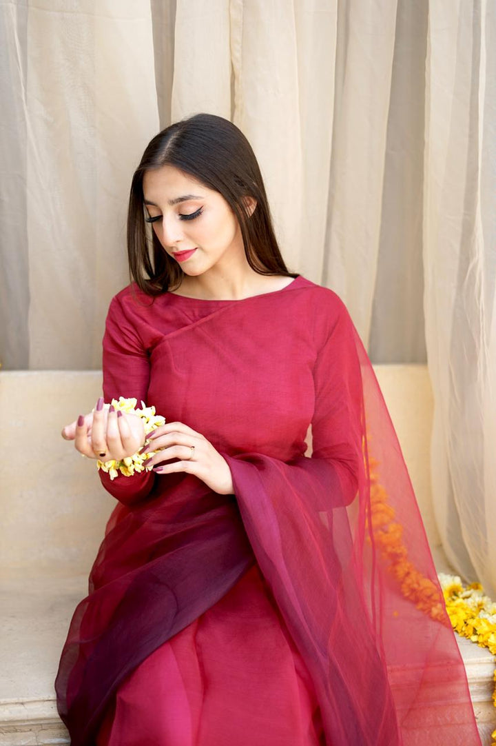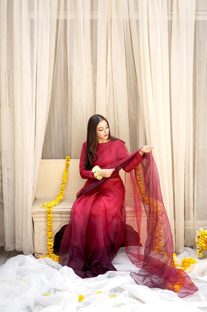 Magenta Pink and Plum Ombre Sarhi With Full fitted Sleeves Blouse