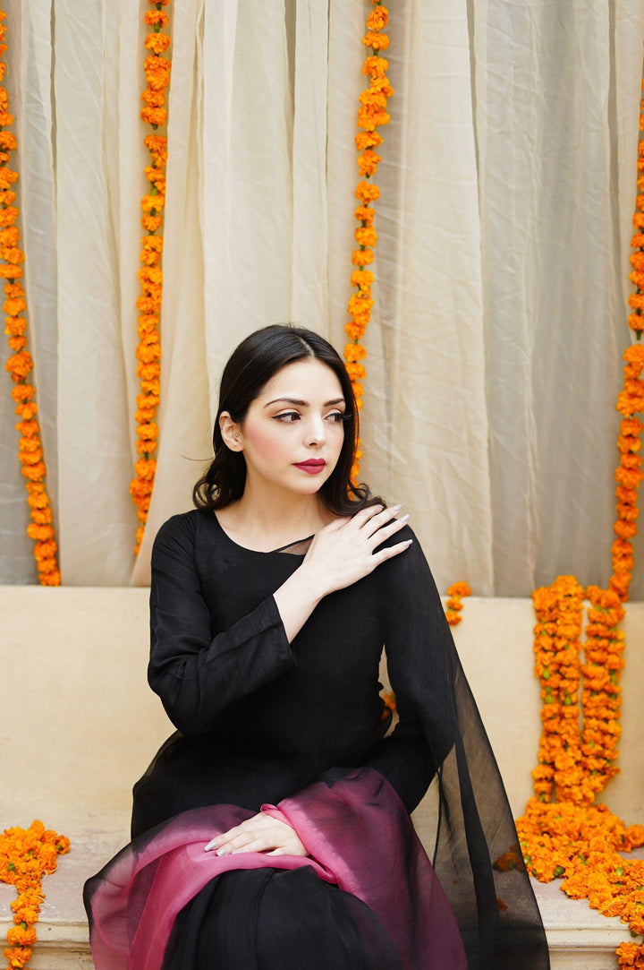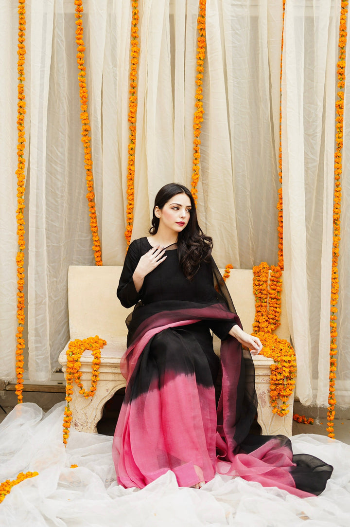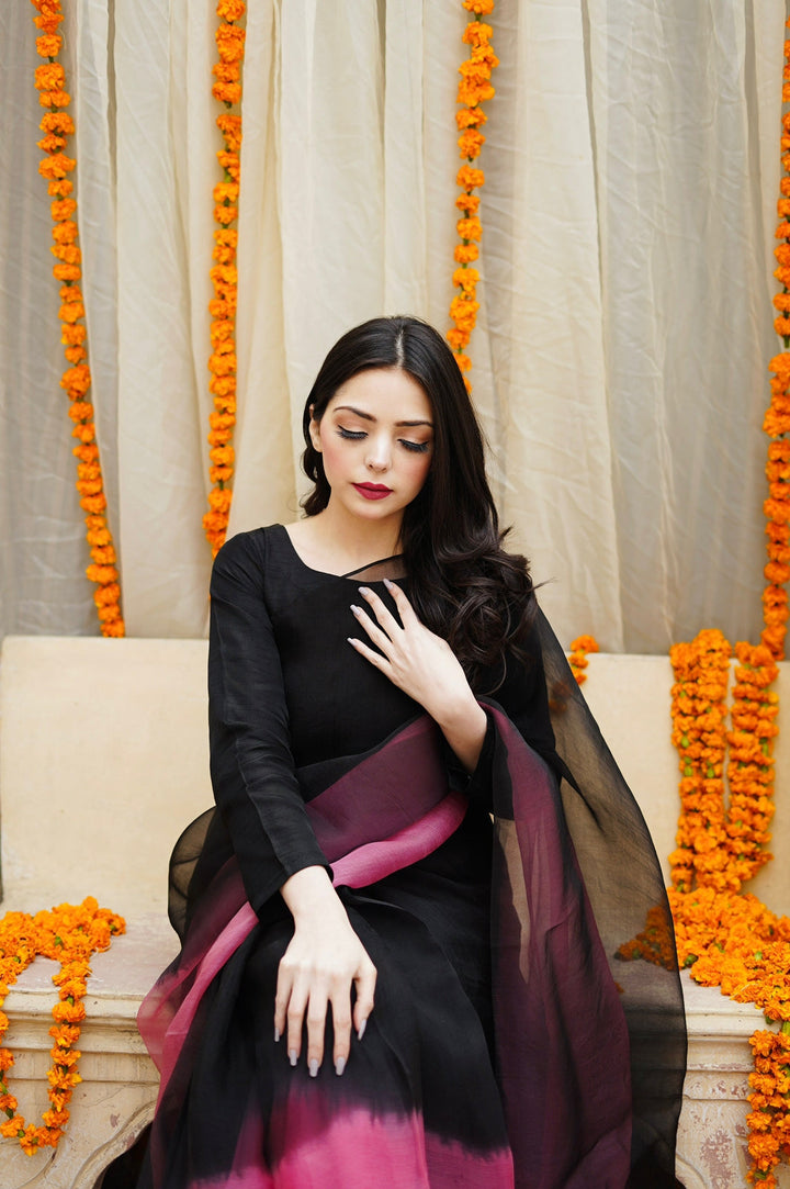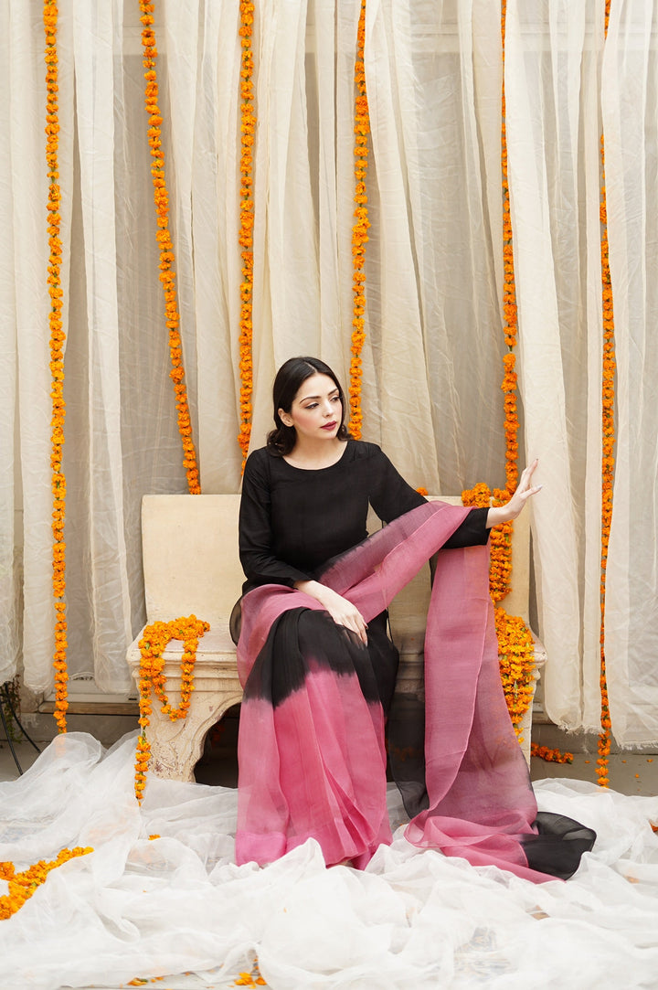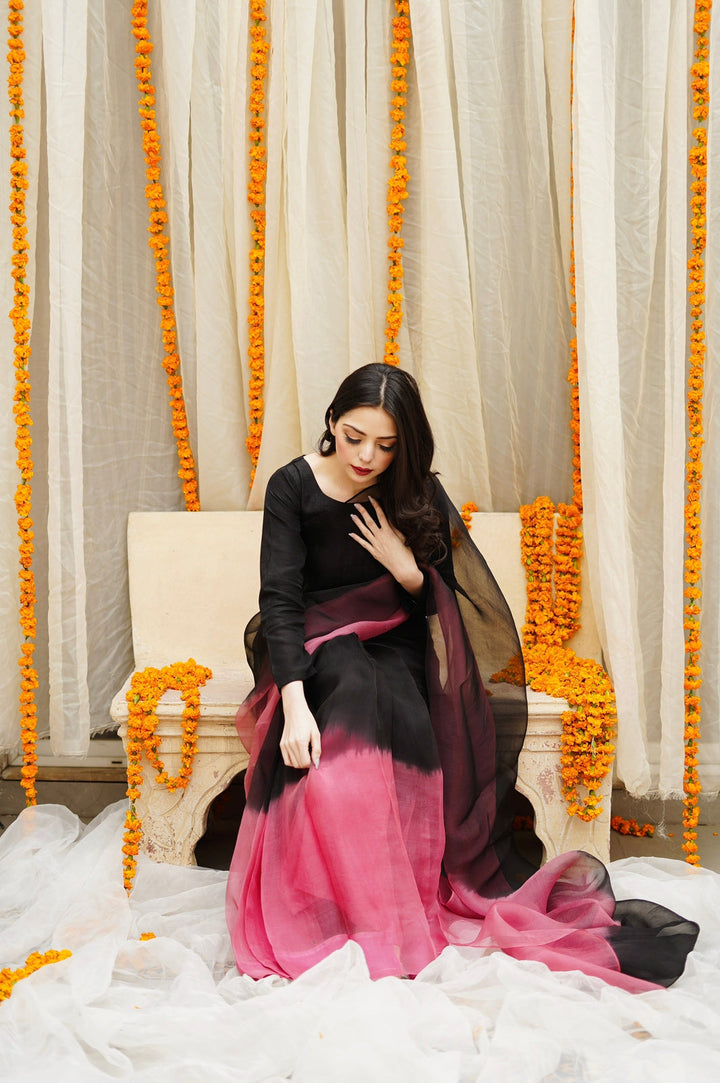 Black to Pink Ombre Sarhi With Full fitted Sleeves Blouse