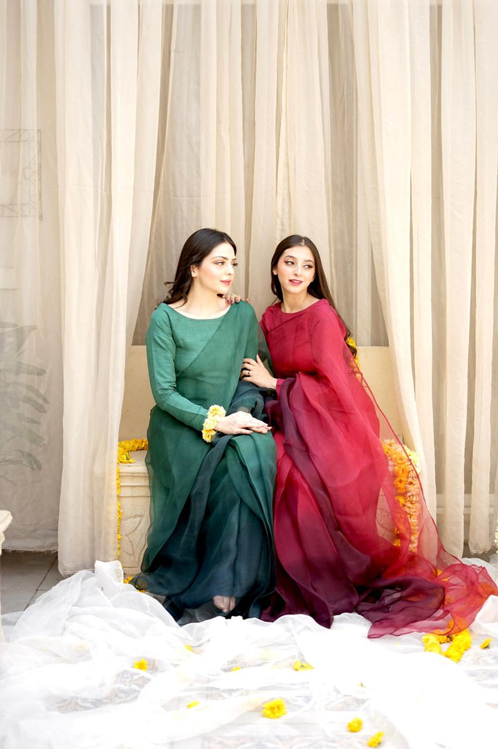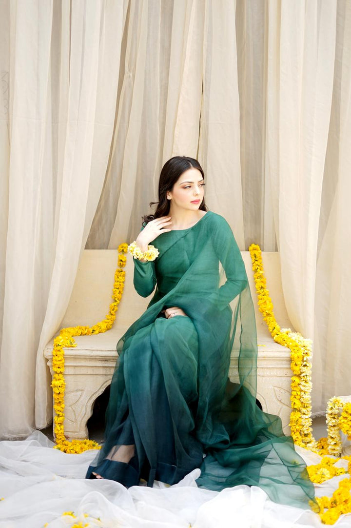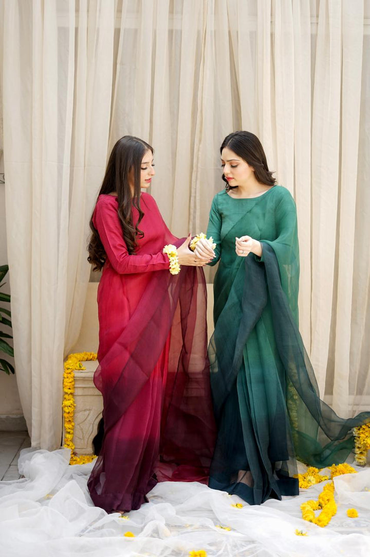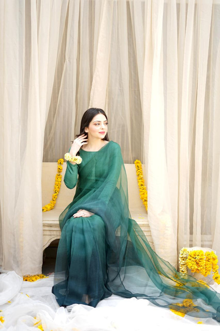 Marine green and Teal Blue Ombre organza Sarhi with full fitted sleeves blouse.
