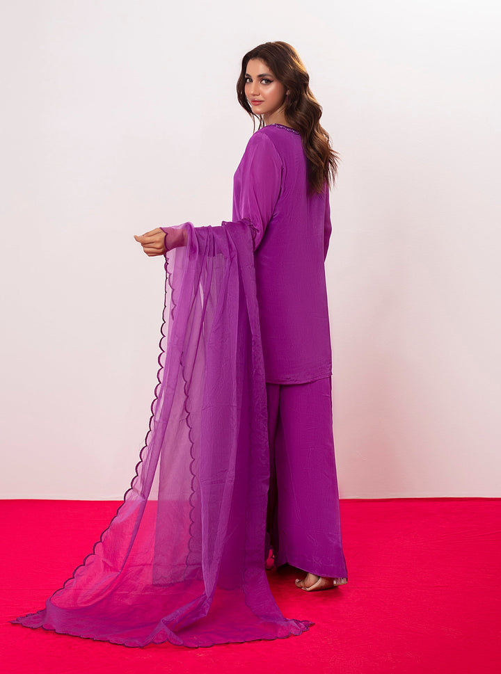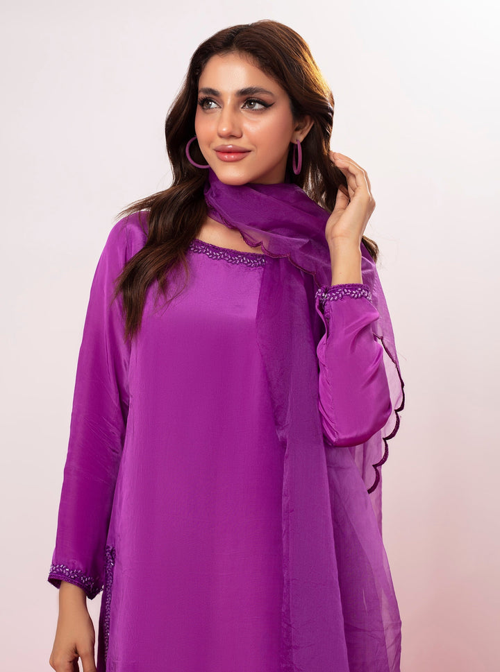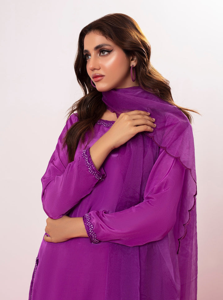 Introducing "Plum" a purple-hued ensemble designed to captivate hearts. Crafted from luxurious raw silk fabric, adorned with delicate sequince lace on the neckline, front, and back, which embodies youthful charm and a touch of glamour. Complete the look with matching sharara, making it a perfect choice for the big day.