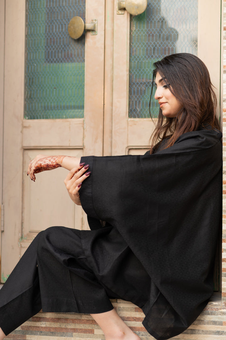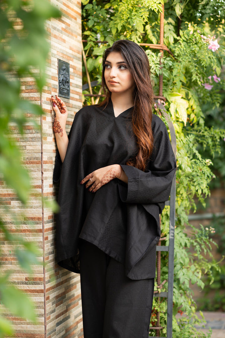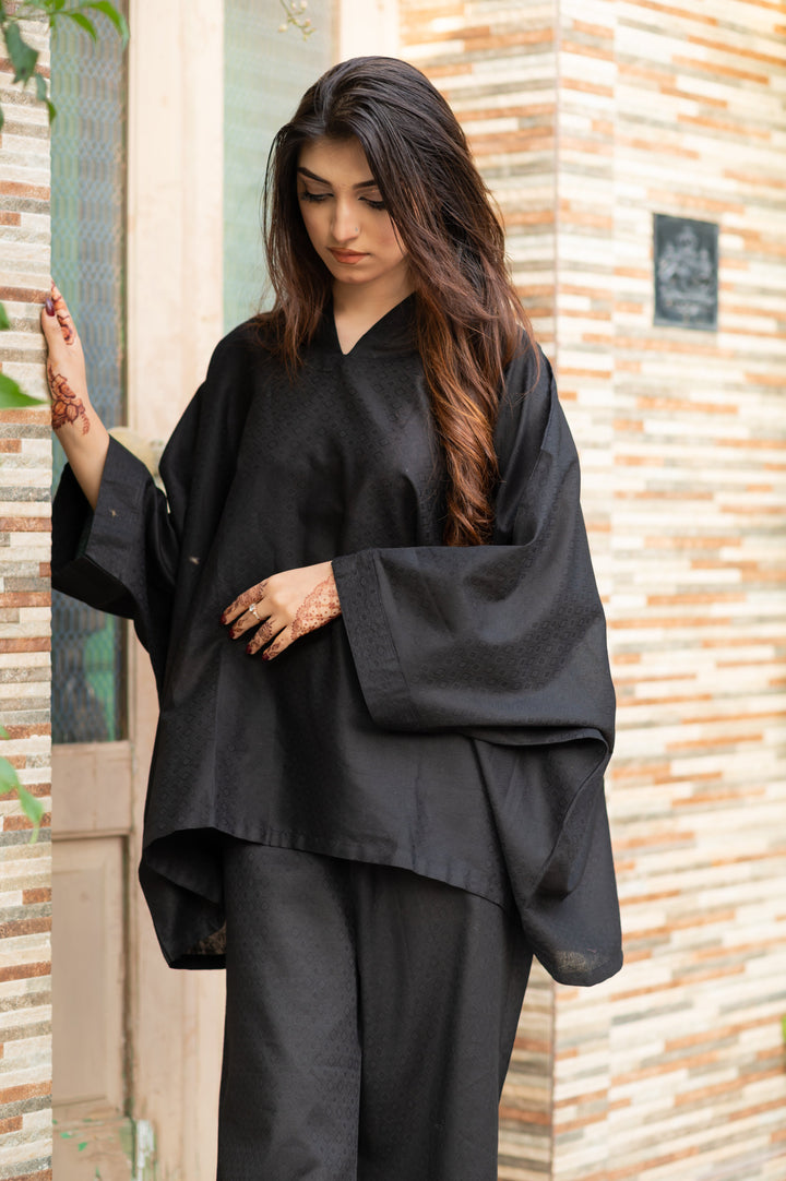 The flowing black kaftan top drapes beautifully, while the matching bottoms offer an easy fit, ensuring you experience both style and comfort. With a refined, textured finish, the jacquard fabric adds a touch of understated luxury, giving you a timeless appeal that radiates confidence and poise.
