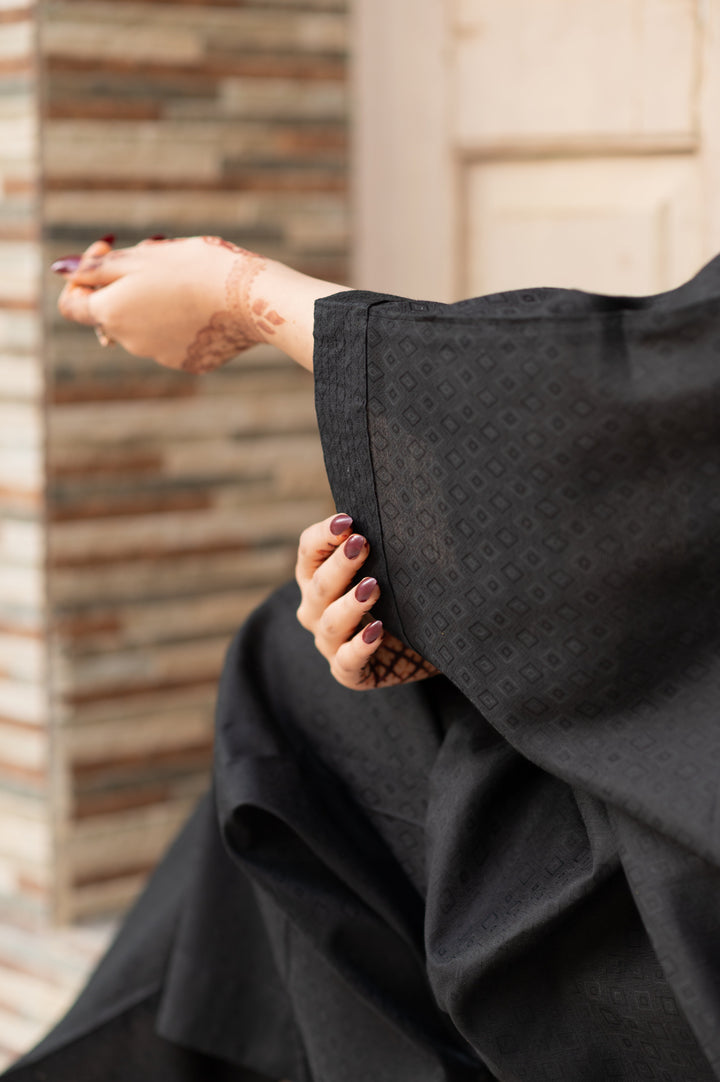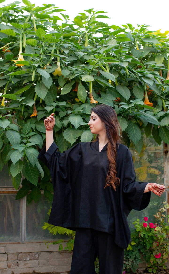 Discover elegance with our Midnight Breeze Kaftan (Ghazal) Co-ord Set in Ghazal, a classic black ensemble that effortlessly combines comfort and sophistication. Crafted from luxurious, self-jacquard fabric, this co-ord set is designed to flatter all body types with its relaxed, free-size silhouette. Embrace a chic Western-inspired look that gracefully flows, making it perfect for any event, from evening gatherings to festive celebrations.