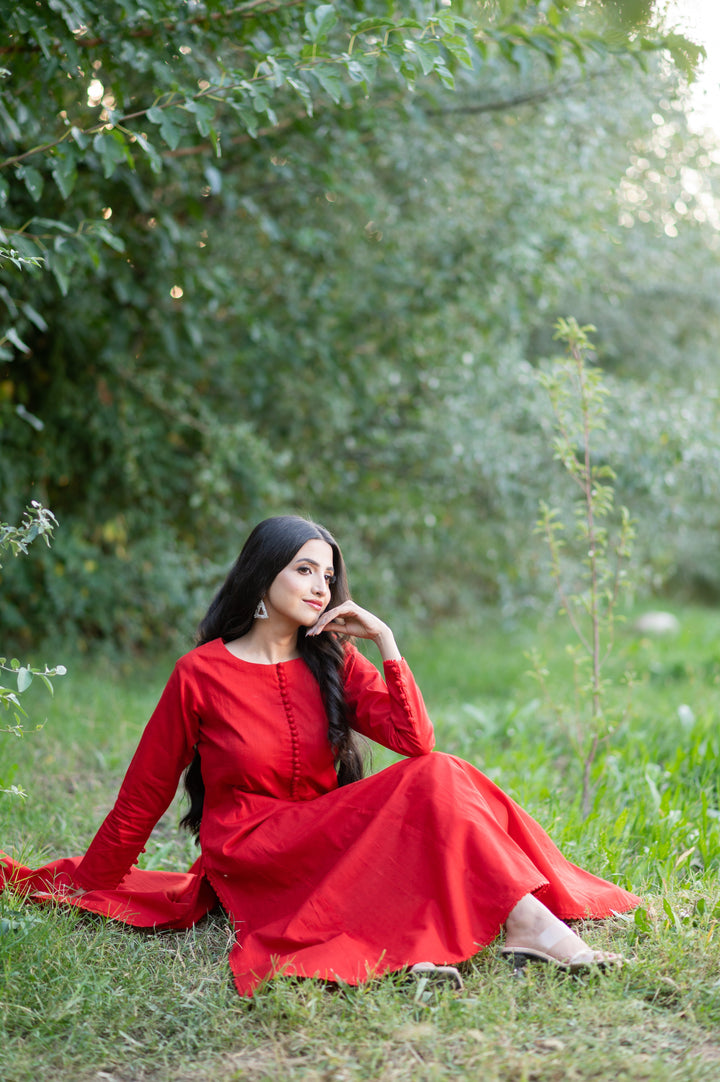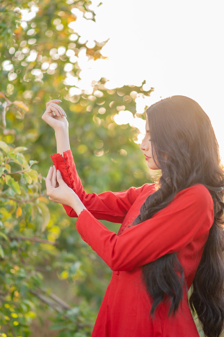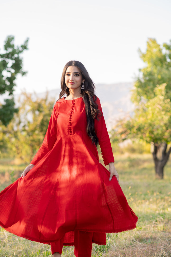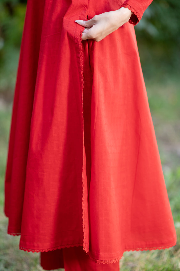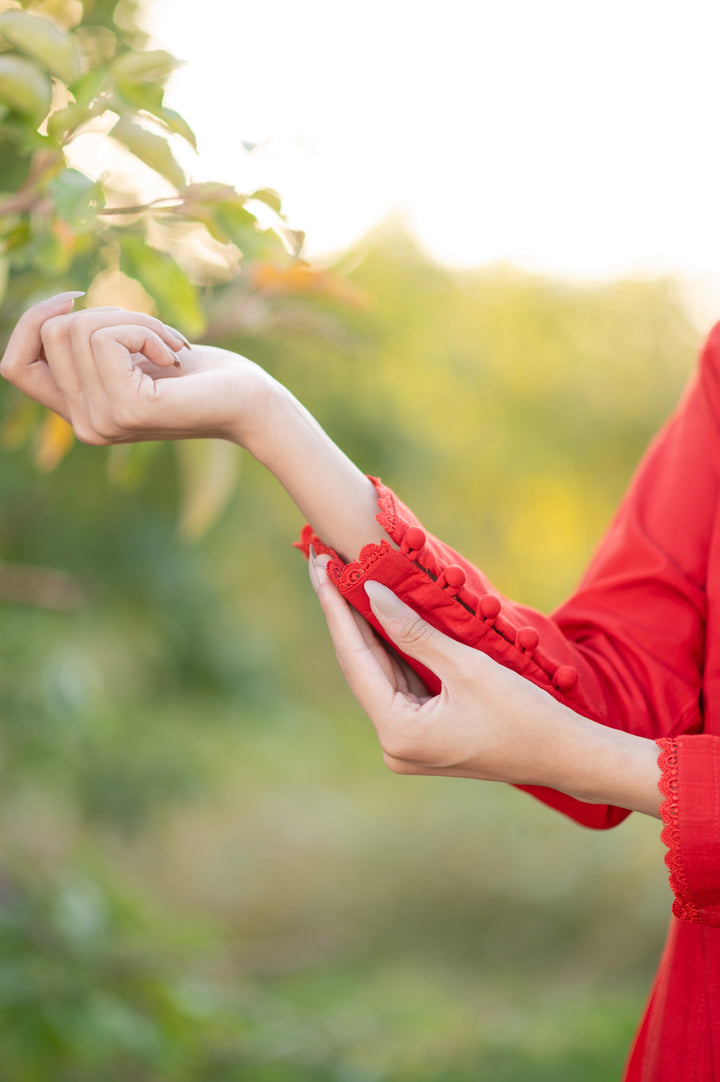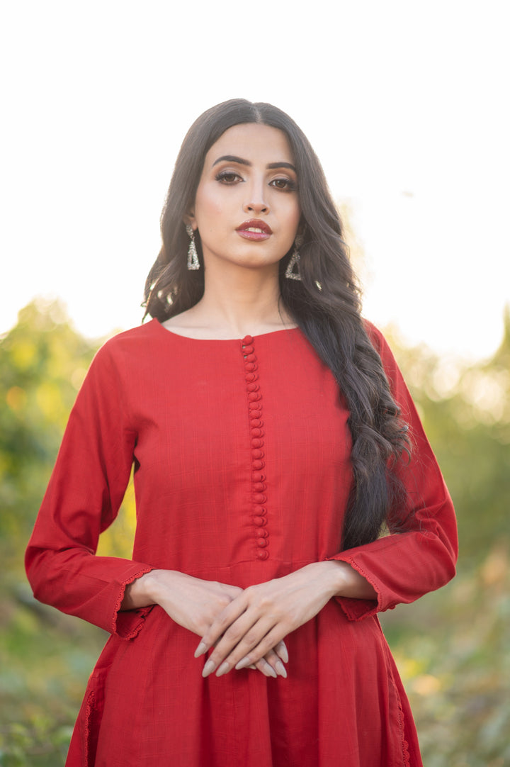Make a statement of timeless elegance with our Scarlet Grace Ensemble (Rangrez), a stunning two-piece set designed to capture the essence of sophistication and allure. This vibrant red ensemble features a long shirt with the graceful flow of a frock and the sleek structure of a tunic. Intricate lace detailing along the hem adds a romantic touch, while handmade buttons on the front and long sleeves bring artisanal craftsmanship to this beautifully tailored piece.