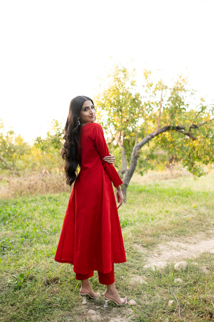 Crafted from luxurious red Jacquard fabric, the Rangrez dress offers a rich, textured weave that combines warmth and sophistication—perfect for winter festivities. The tailored trousers complete the ensemble, providing a refined look that suits festive gatherings, evening events, or any occasion calling for polished elegance. With its vibrant hue and intricate details, the Scarlet Grace Ensemble is made to ensure you stand out with poise and confidence.