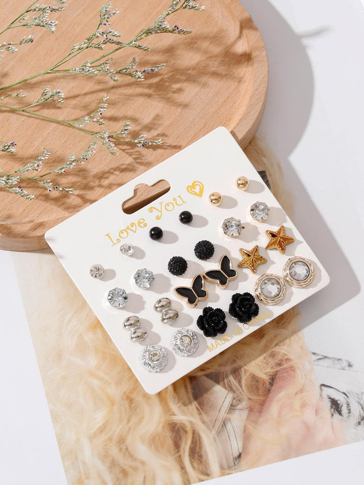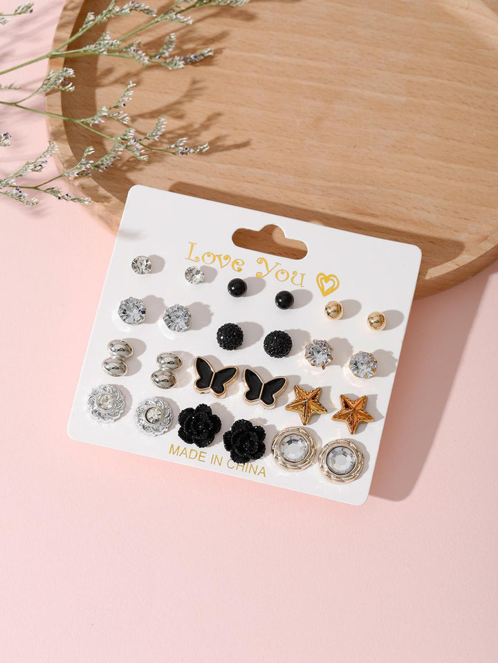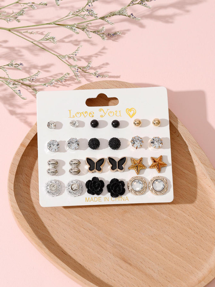 Shein - Rhinestone & Flower Decor Stud Earrings