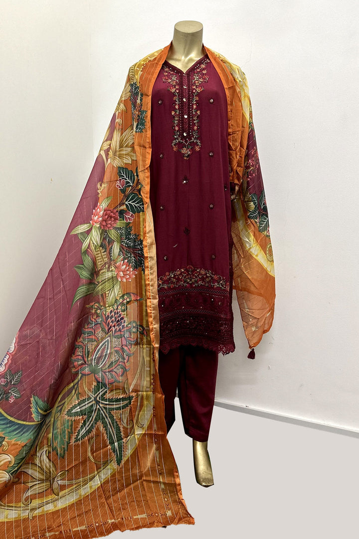 Sada Bahar Stitched 3 Piece Luxury Emb Lawn Collection'2024-MCK-03-Maroon
