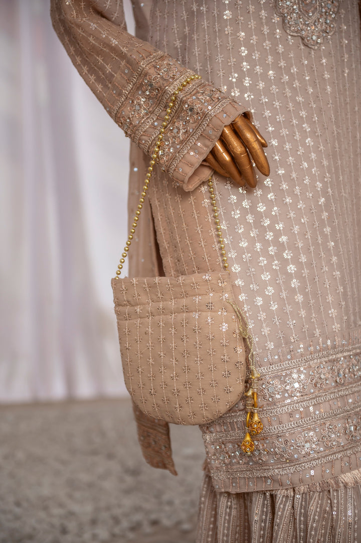 Stylish chiffon gharara embellished with detailed embroidery, paired with a lightweight chiffon dupatta accented with a scalloped lace border.