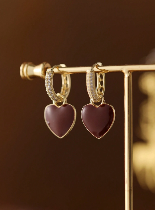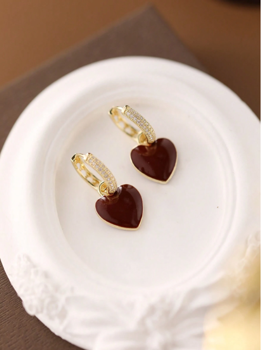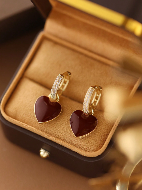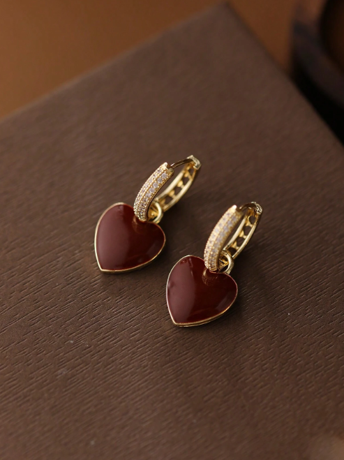 Shein - 1 Pair Classic Vintage Copper Alloy Gold Plated Micro-Inlaid Rhinestone Heart Hoop Earrings