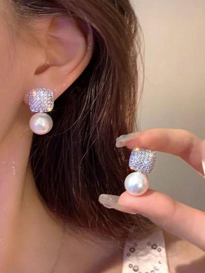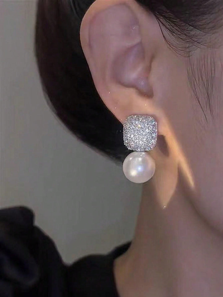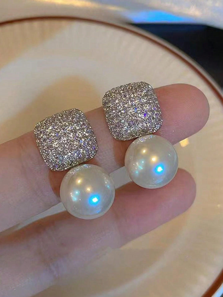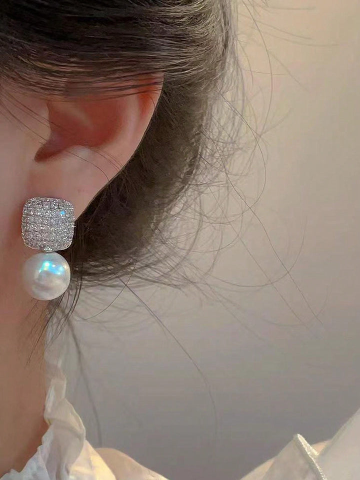 Shein - 1pair Exquisite Square Earrings With Imitation Pearl Pendant, Zinc Alloy Material Vintage & Elegant Style Women's Party Jewelry Accessory