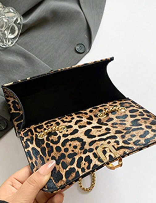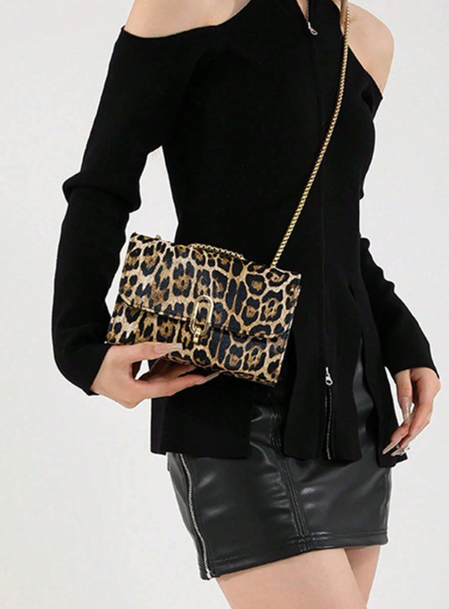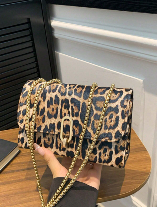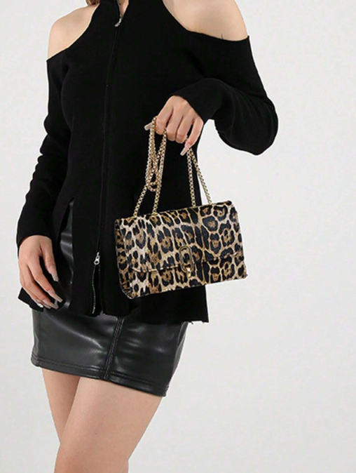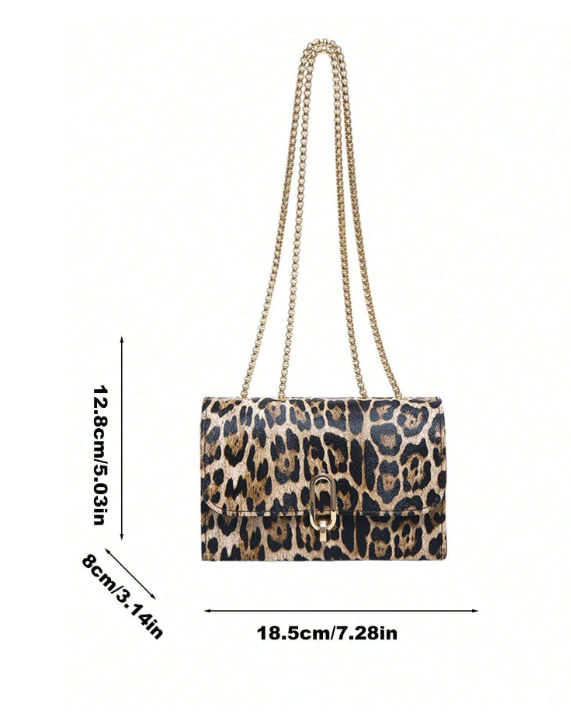 Shein - 1pc A Retro Fashion Leopard Print Mini Square Bag With Flap Opening, Metal Double Chain Shoulder Bag
