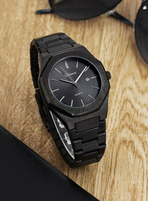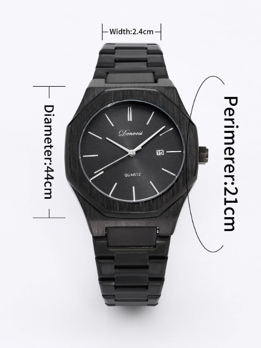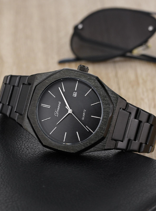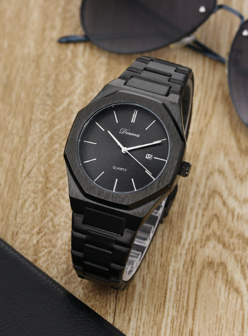 Shein - 1pc Black Stainless Steel Strap Business Glow In The Dark Waterproof Calendar Polygon Dial Quartz Watch
