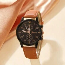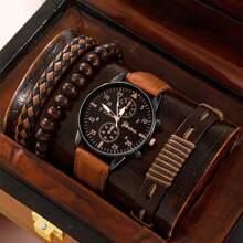 Shein - 1pc Brown Leather Quartz Watch And Gift Set For Fashionable Businessman