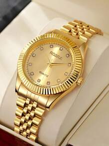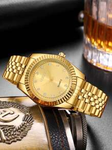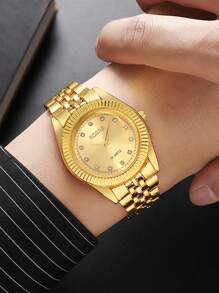 Shein - 1pc Fashionable Business Classic Men's Round Gold Steel Band Quartz Wristwatch