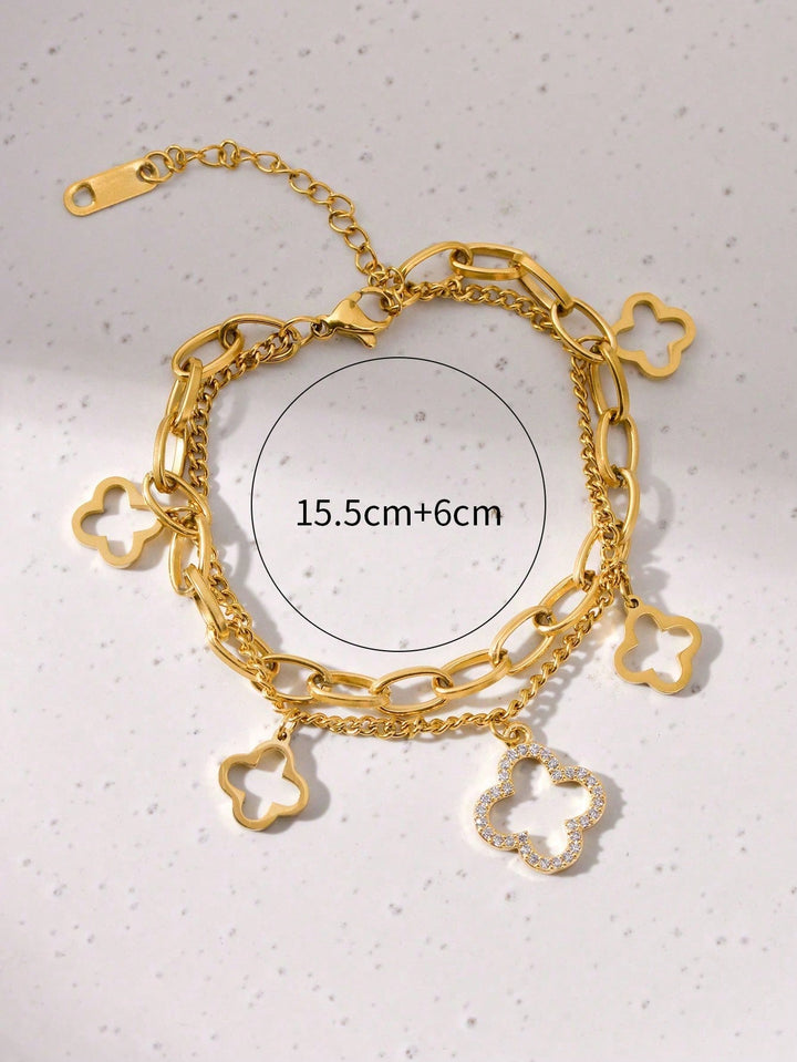 Shein - 1pc Fashionable Double Layered Four-leaf Clover Titanium Steel Bracelet For Women, Versatile Accessory