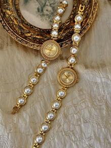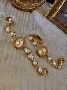 Shein - 1pc Gold French Fashion Elegant Women Water-Resistant 30m Quartz Watch, With Pearl Strap, Bohemian Vintage Court Style Circular Quartz Wristwatch For Women,