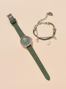 Shein - 1pc Ladies' Daisy Flower Print Pu Leather Band Casual Quartz Watch And 1pc Bracelet