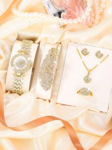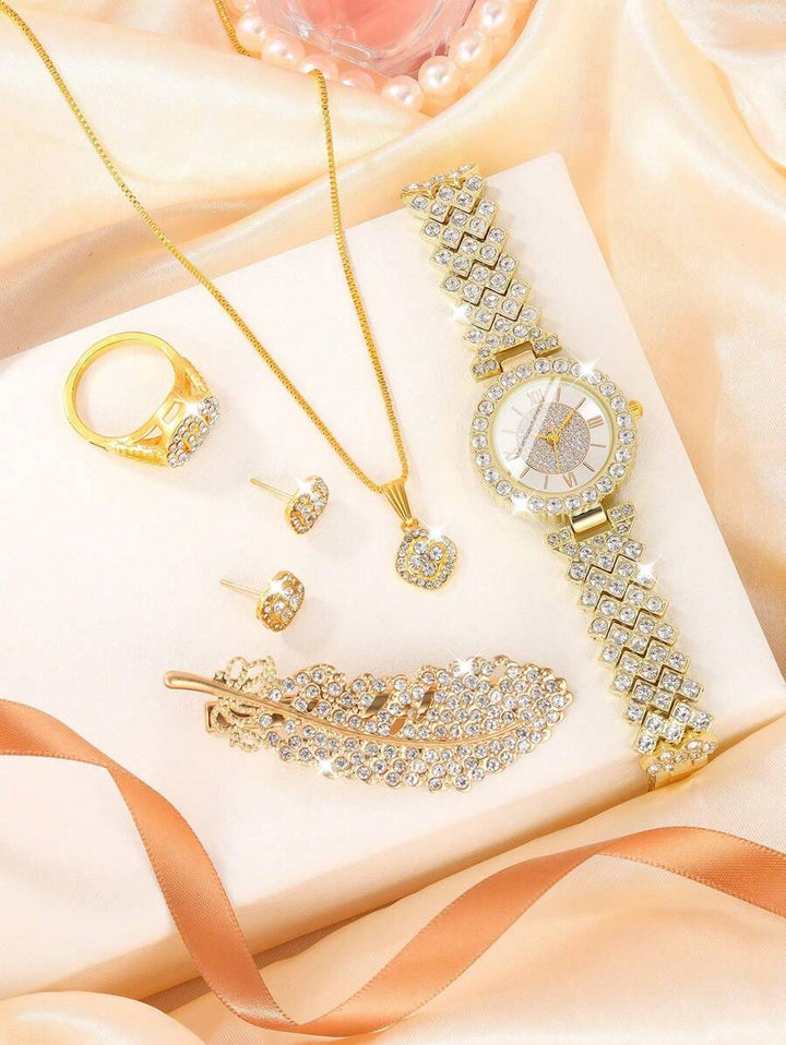 Shein - 1pc Luxury Bling Full Diamond Gold Roman Alloy Watch And 5pcs Square Rhinestone Jewelry Set And Feather Hair Clip