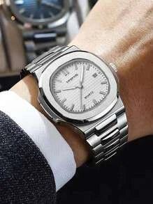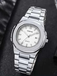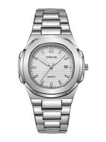 Shein - 1pc Men Silver Zinc Alloy Strap Casual Date Round Dial Quartz Watch