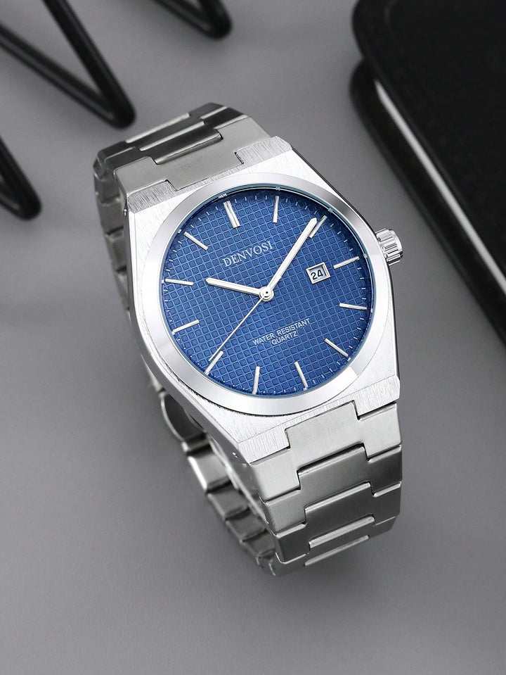 Shein - 1pc Men's Stainless Steel Strap Quartz Wristwatch With Date Display, Water Resistant, Night Light Function