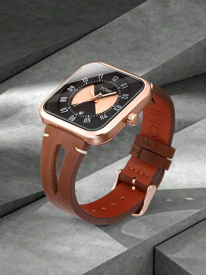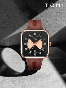 Shein - 1pc Men's Stylish Hollow-Out Leather Strap Quartz Watch
