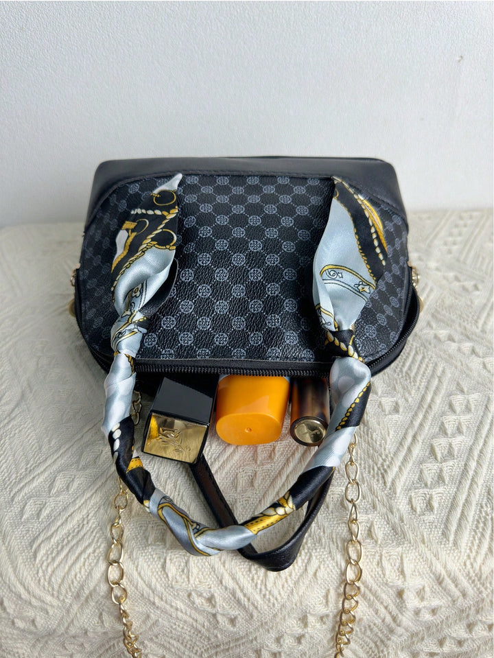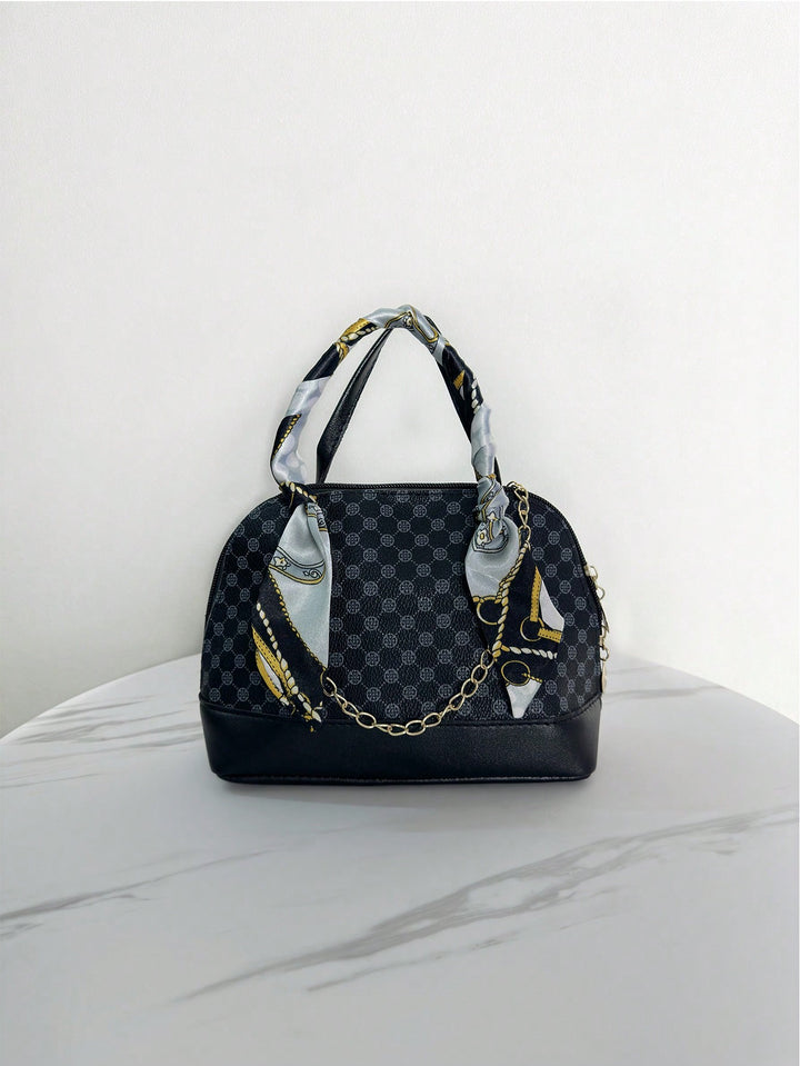 Shein - 1pc Mini Geometric Pattern Handbag With Silk Scarf, Chain And Shell Decoration, Can Be Carried By Hand Or Crossbody