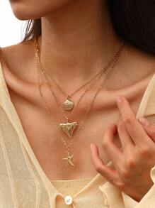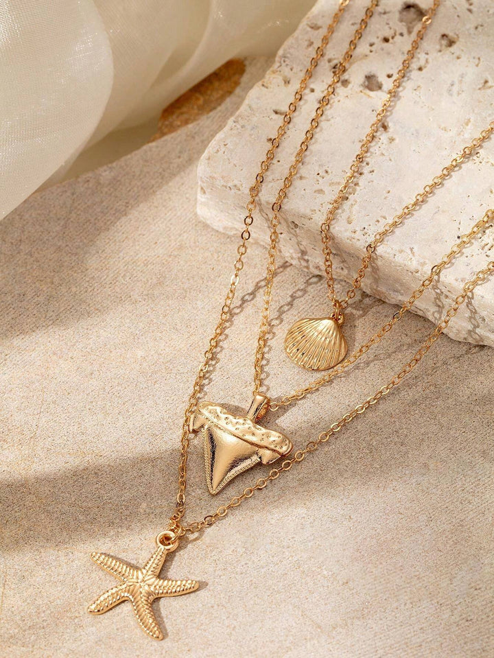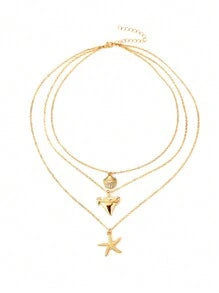Shein - 1pc Multi-Layer Geometric Metal Starfish & Shell Necklace