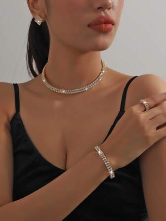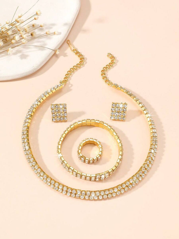 Shein - 1pc Necklace, 1pc Bracelet, 1pc Ring, 1pair Earrings Fashionable Claw Chain Diamond-Studded Jewelry Set
